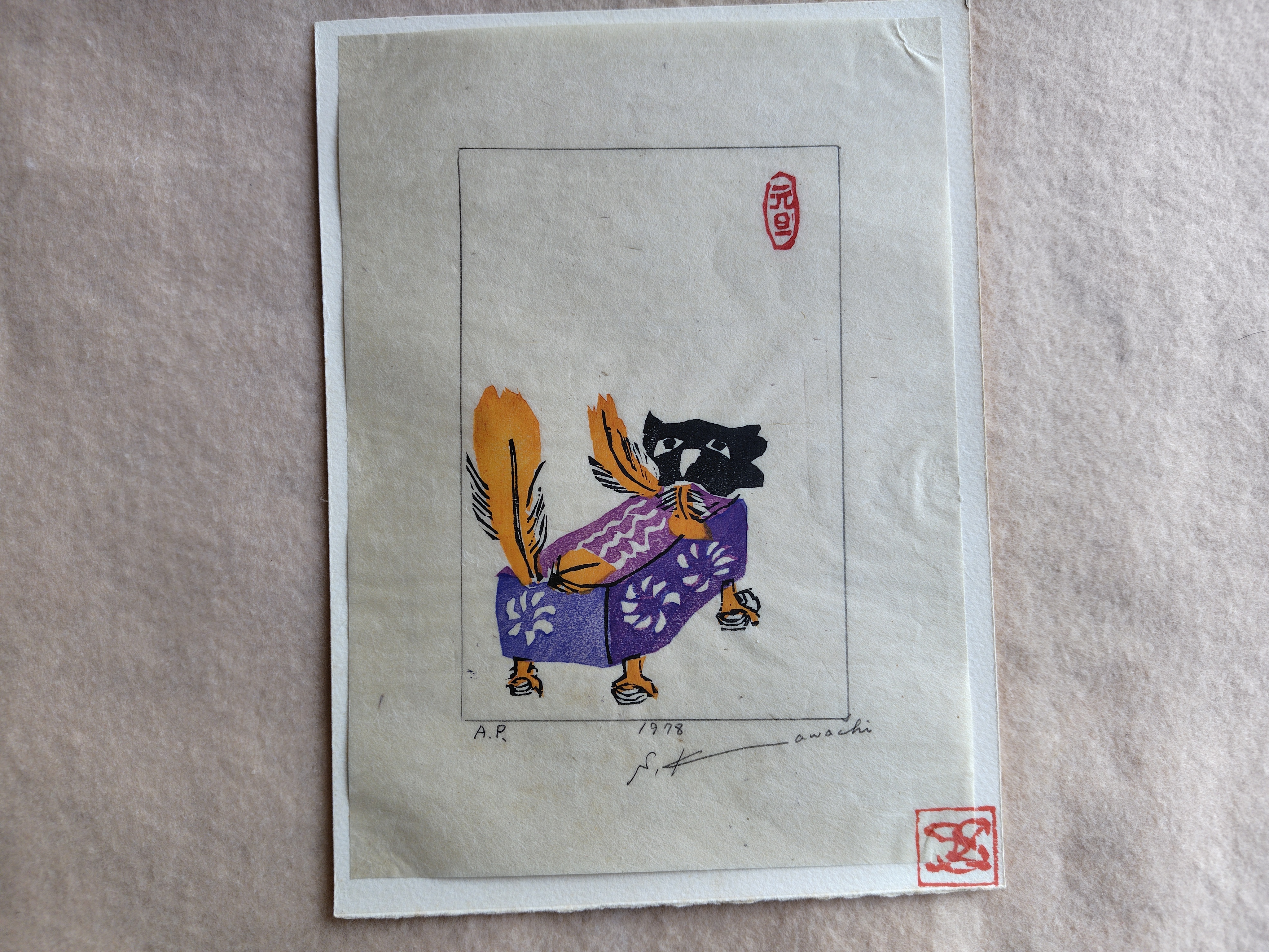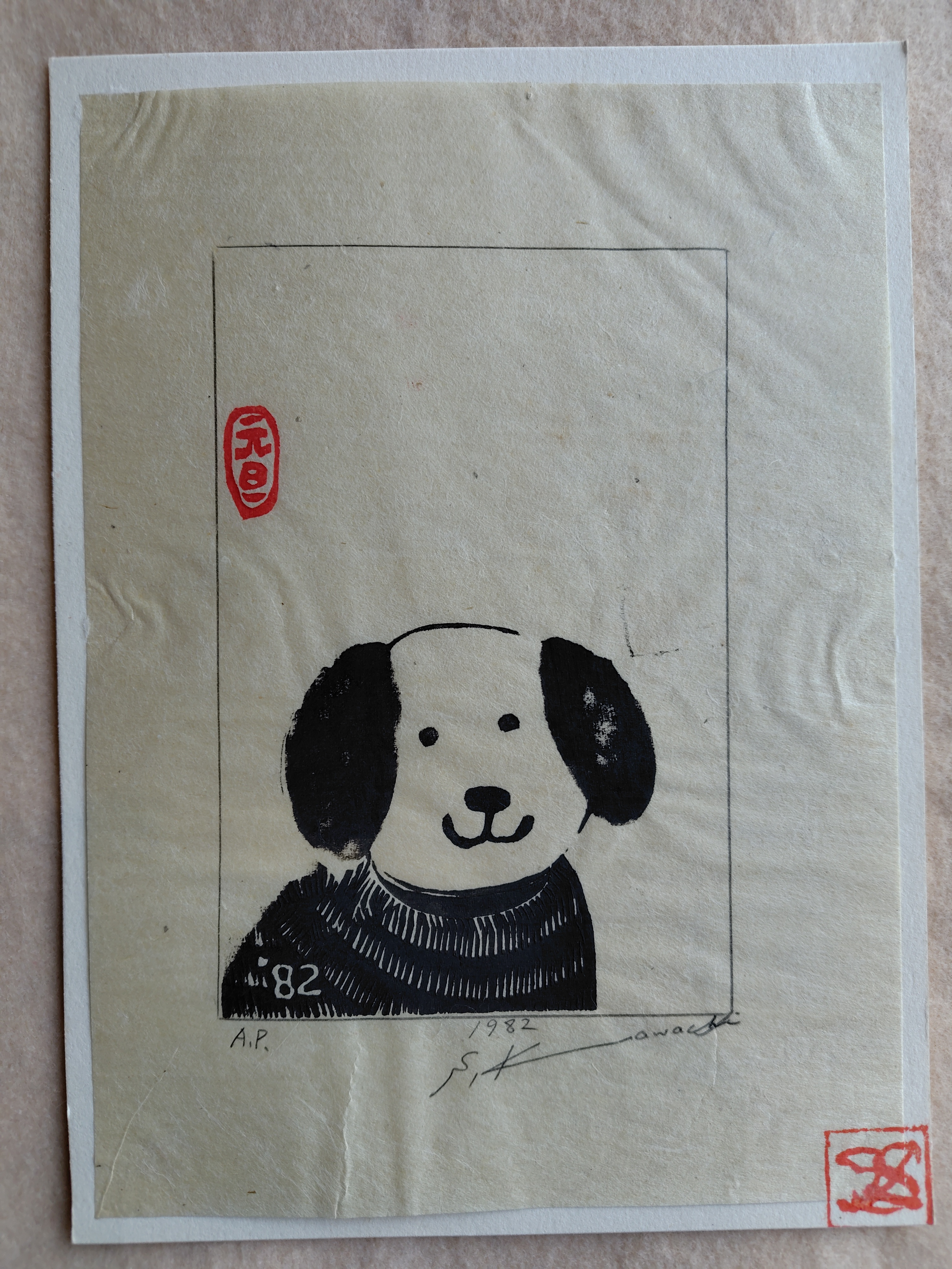 河内成幸(かわち せいこう) 木版画 戌 年賀 1982年