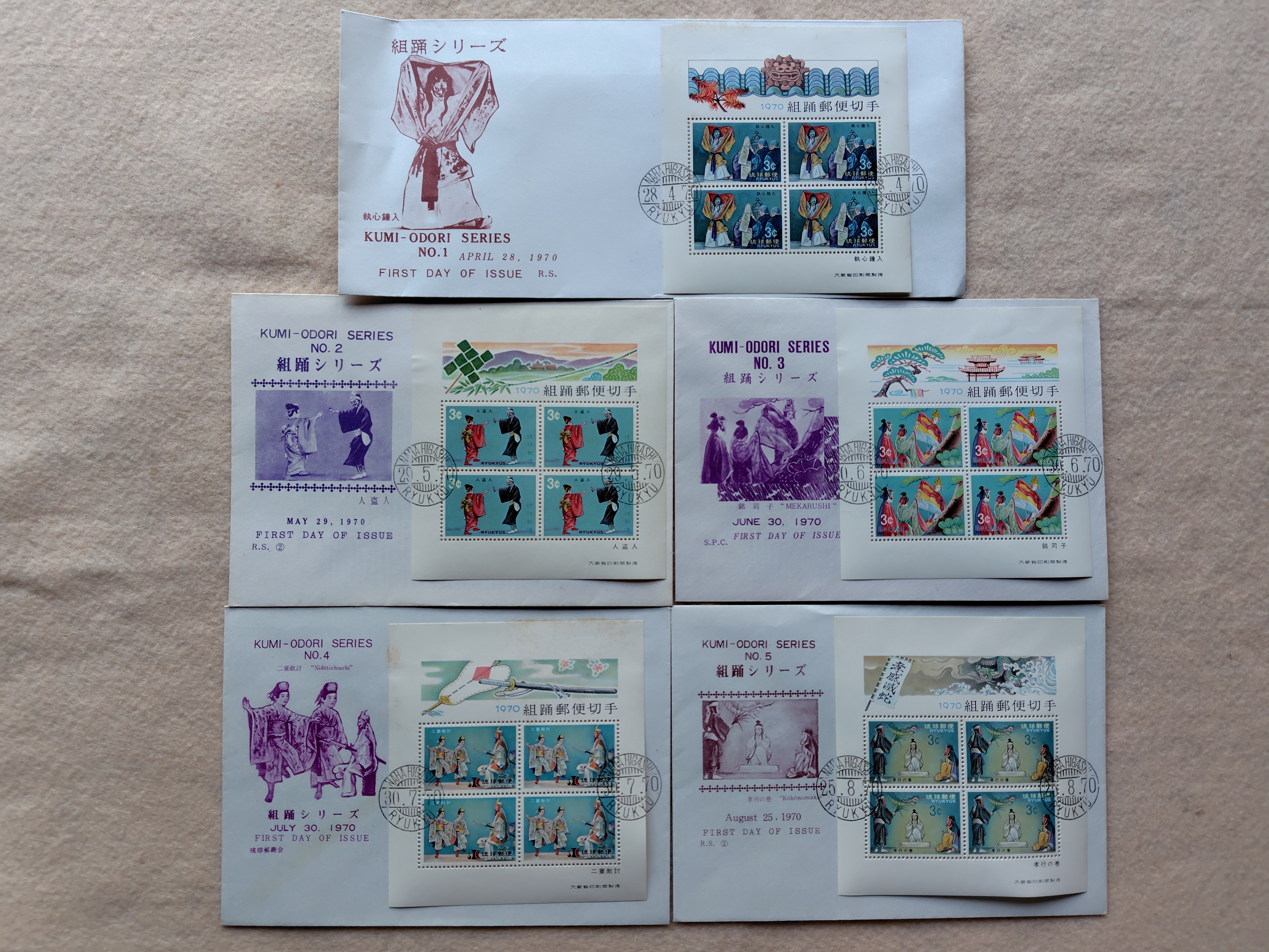 初日カバー 琉球郵便 組踊シリーズ NO。1~NO。5 1970