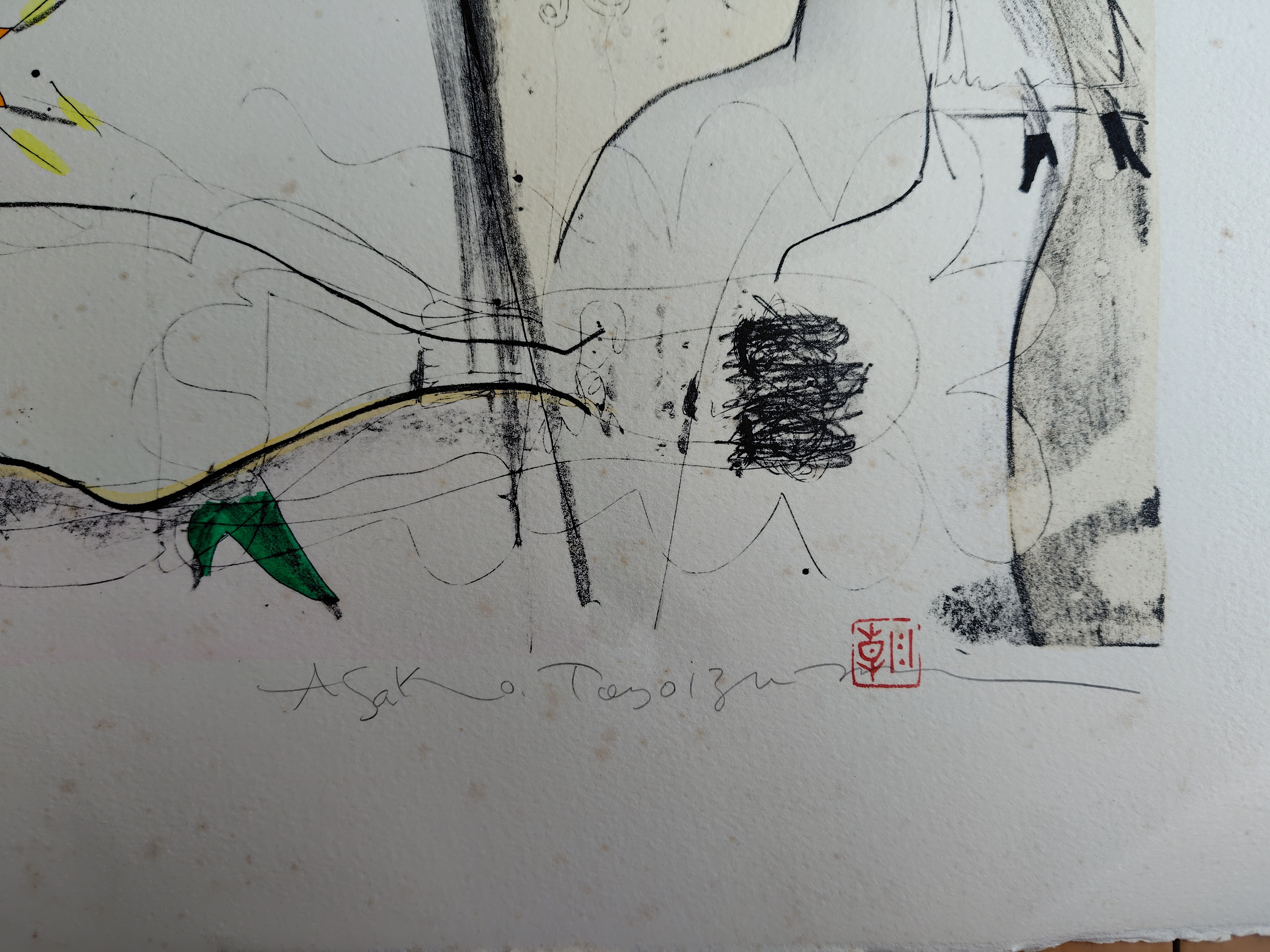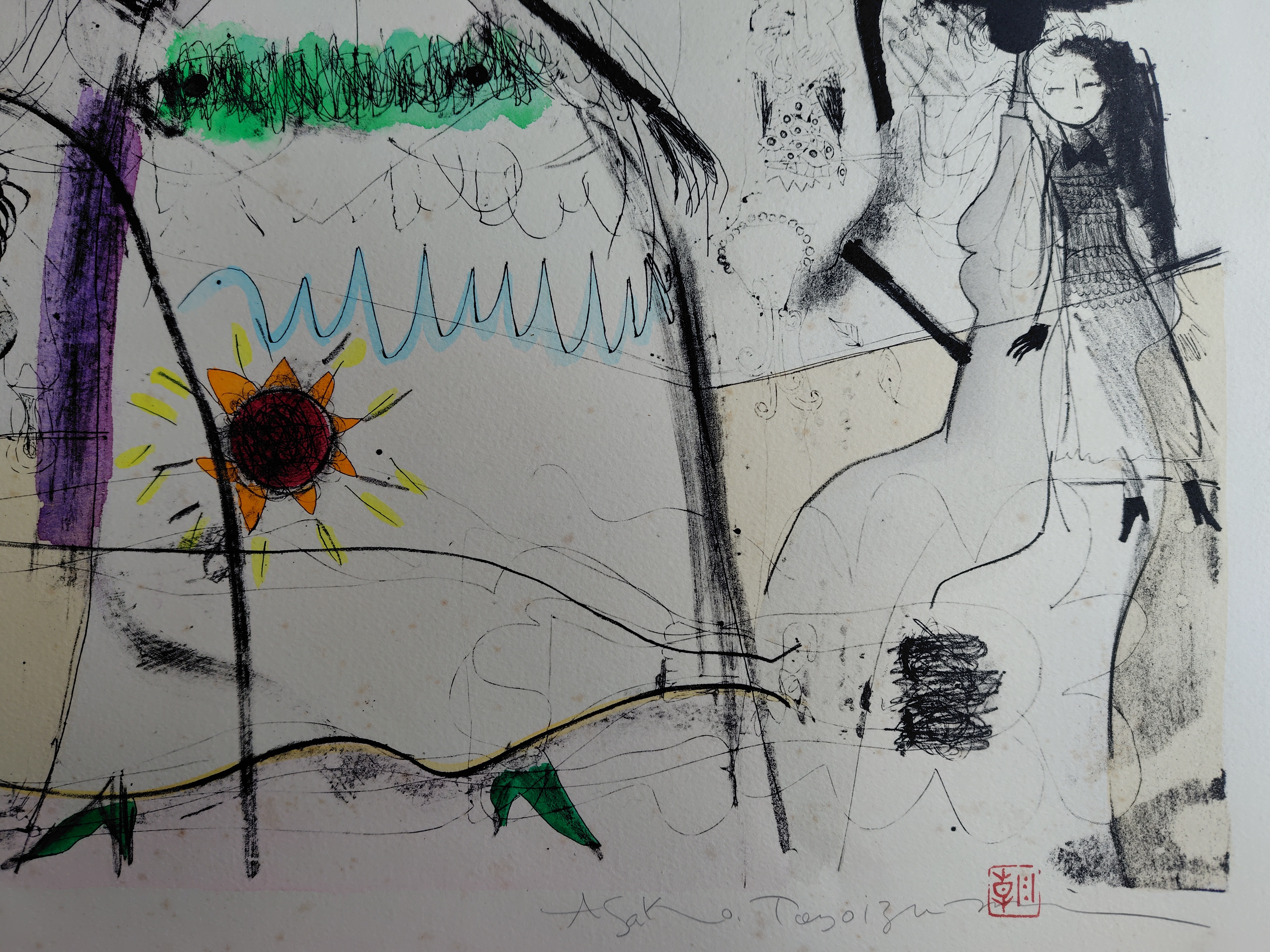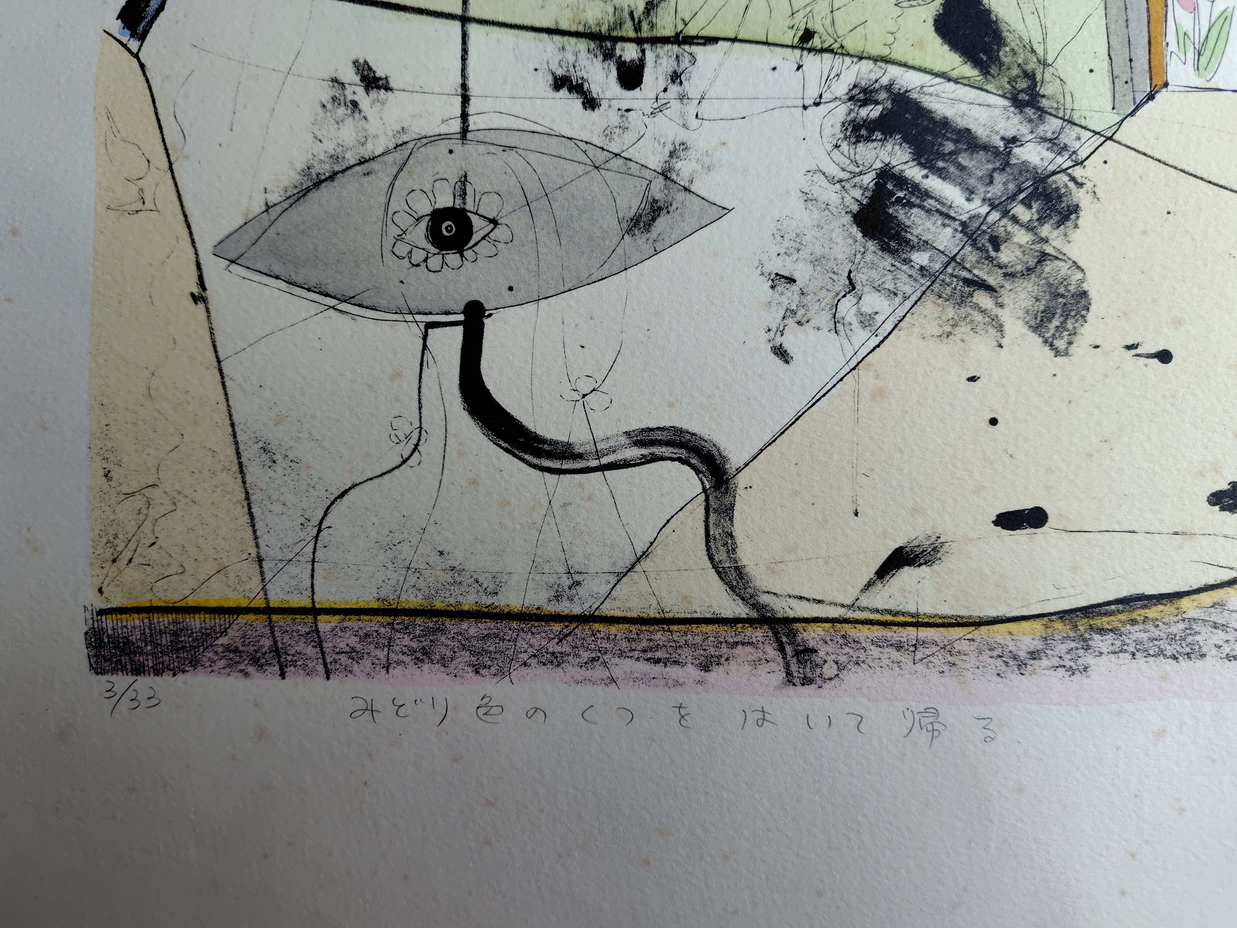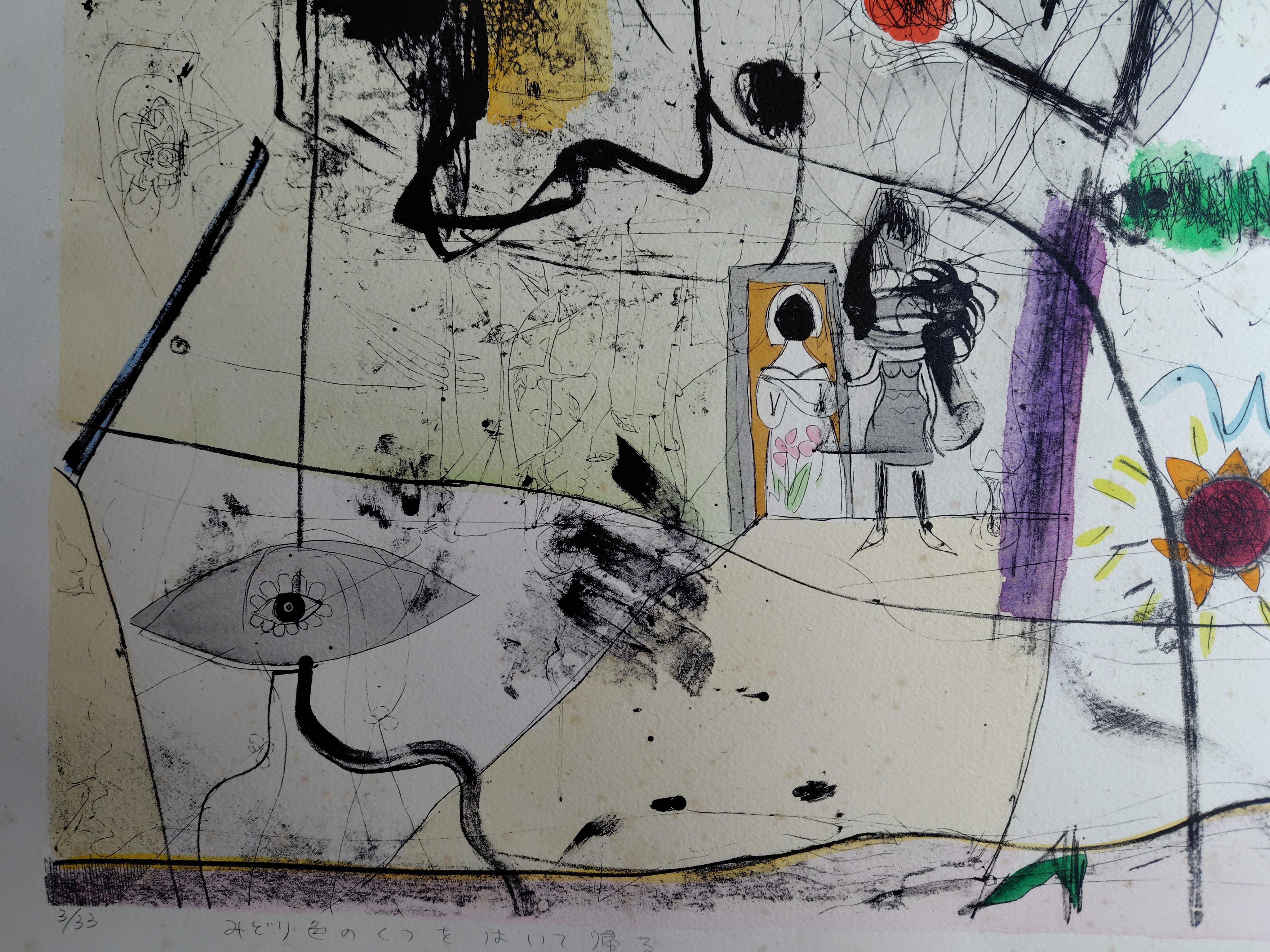 豊泉朝子(とよいずみ あさこ) リトグラフ 『緑色のくつをはいて帰る』 2026.03.03 版画/油絵/浮世絵 豊泉朝子さんのリトグラフ作品です。 シートの大きさは、56x76㎝ エディションナンバーは、3/33 状態は、シミが少しあります。