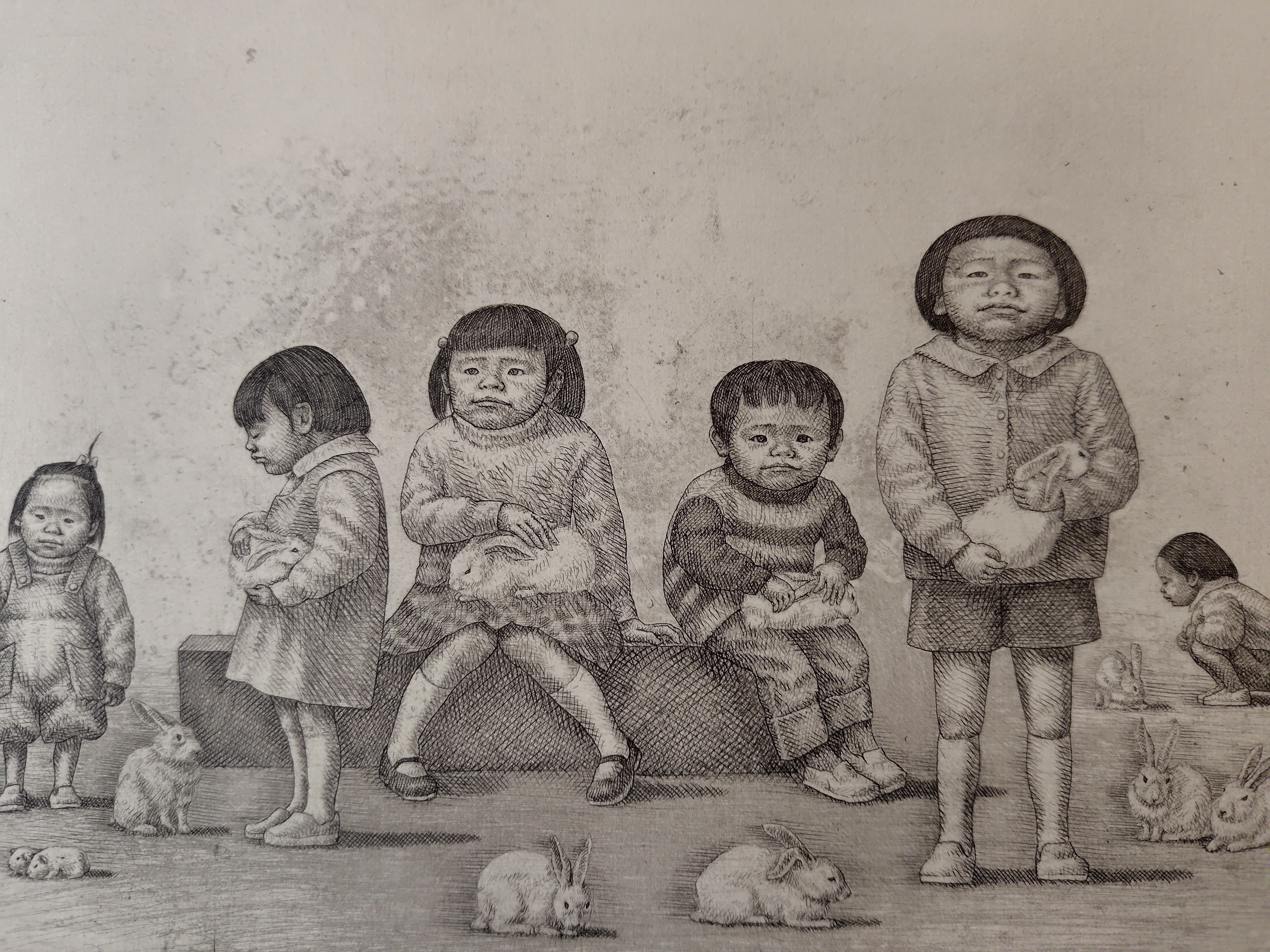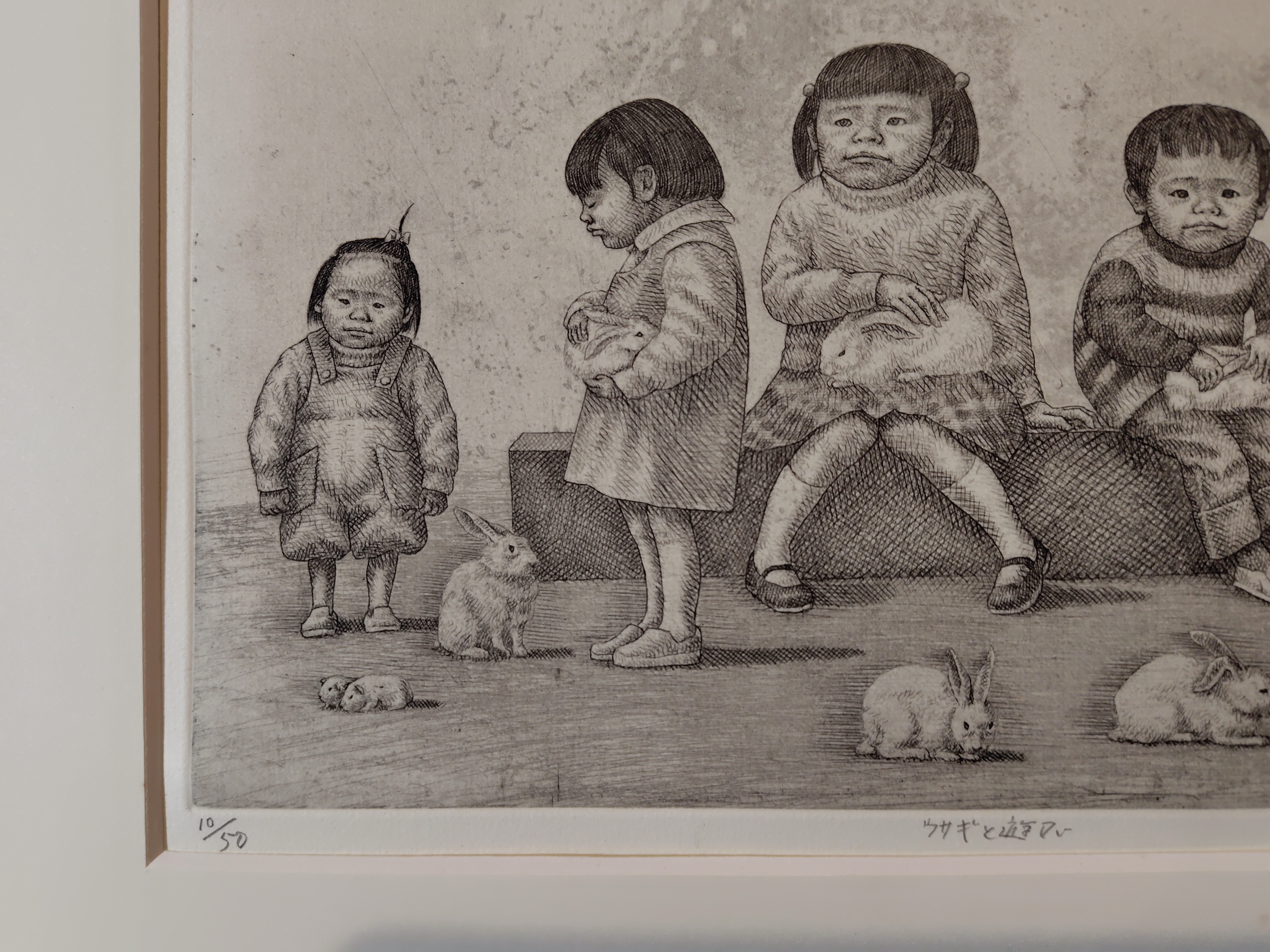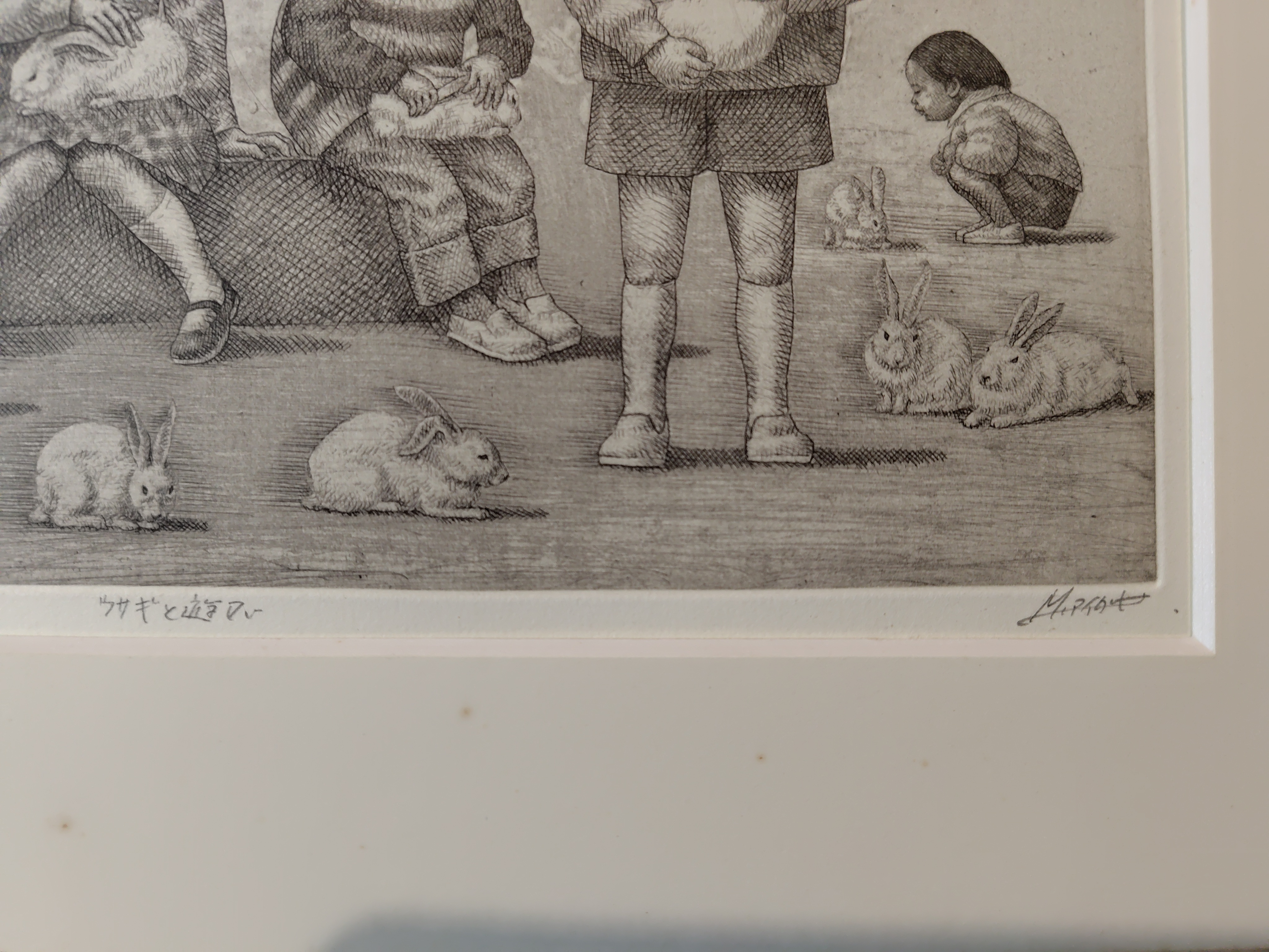 相笠昌義(あいがさ まさよし)銅版画 ウサギと遊ぶ 2026.03.17 版画/油絵/浮世絵 相笠昌義さんの銅版画作品です。タイトルは、ウサギと遊ぶエディションナンバーは、10/50マット装済みです。大きさは、28x39㎝状態は、良好です。