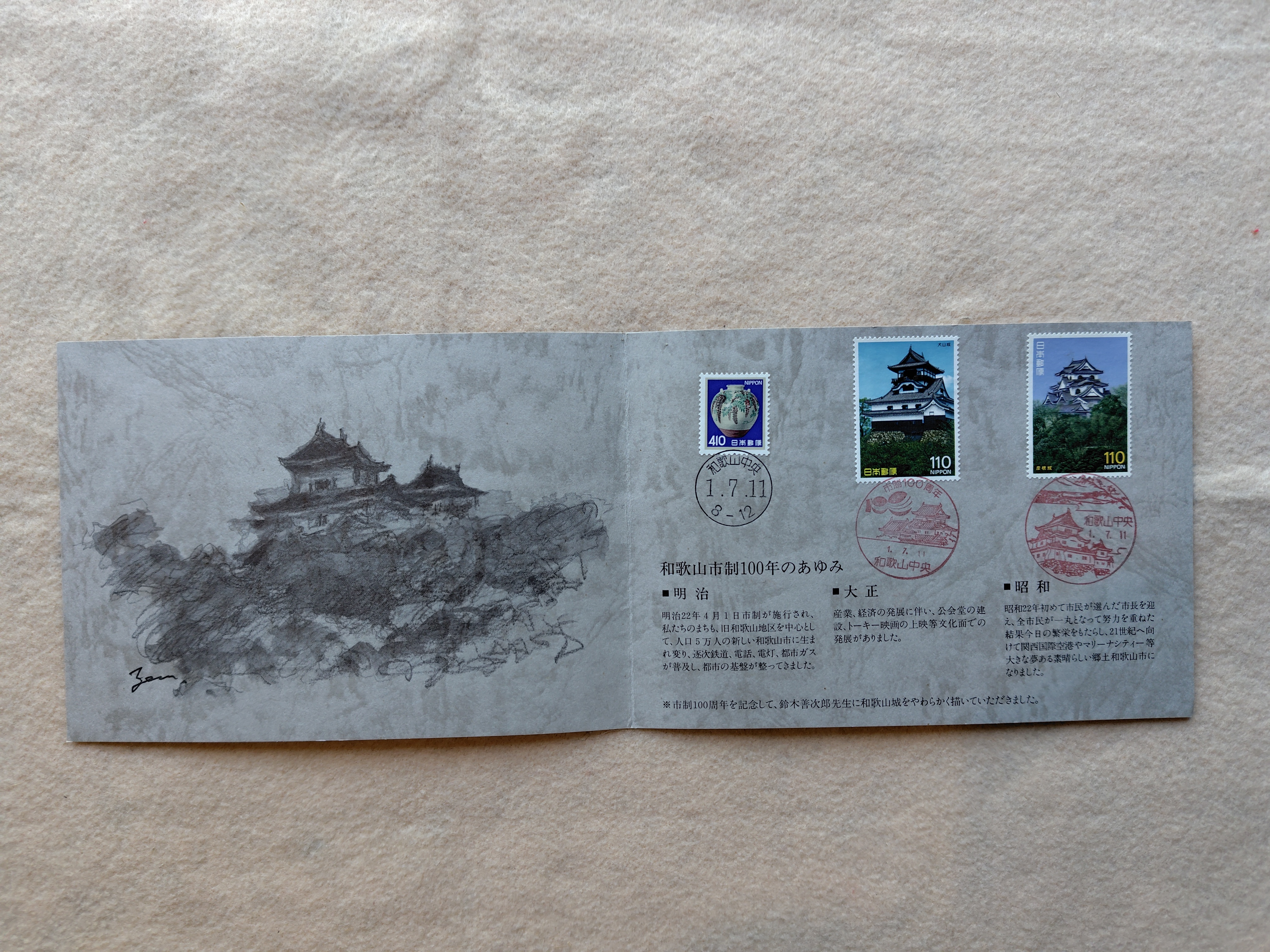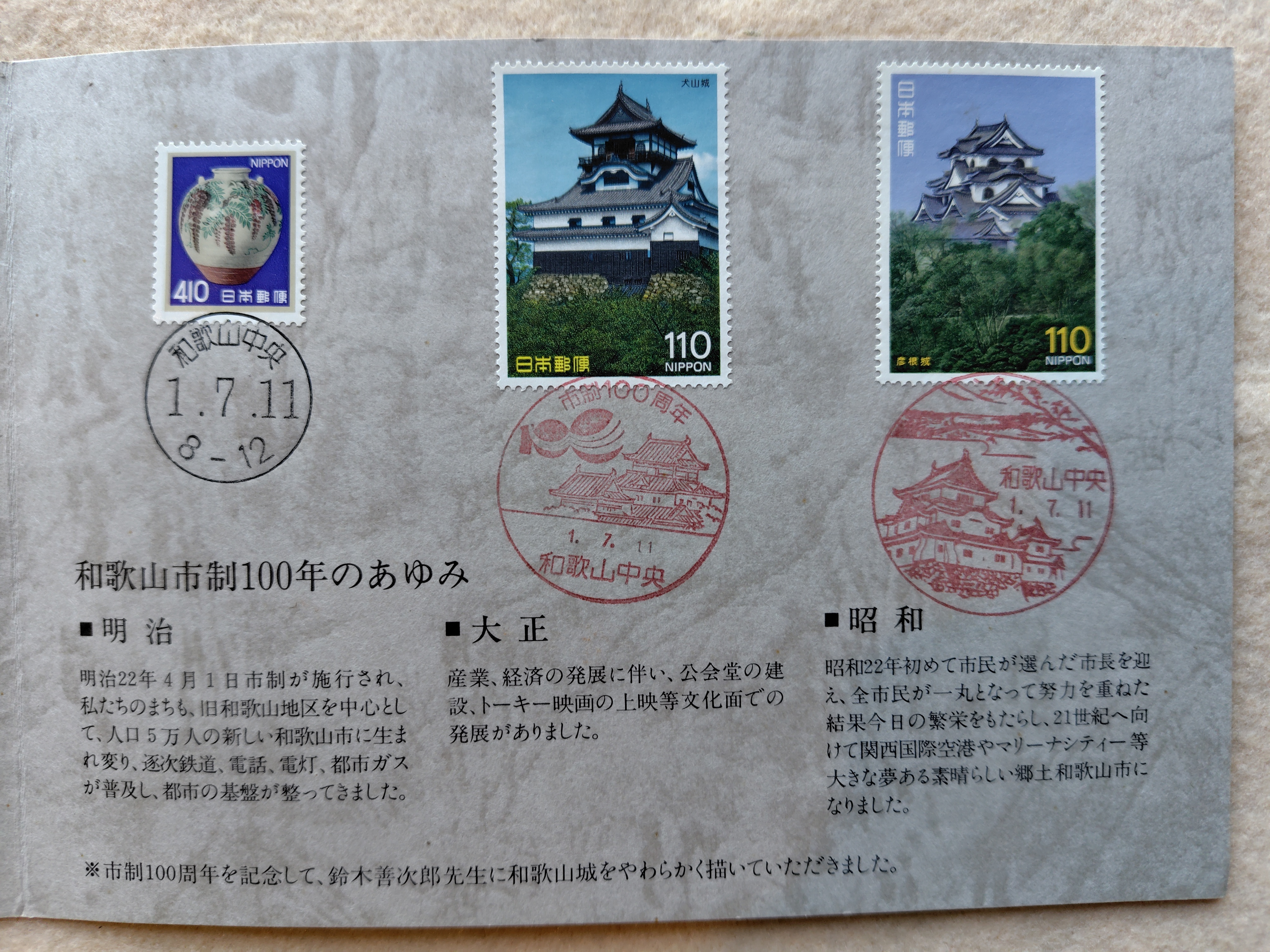 記念切手帳 わかやま百年 平成元年 2026.04.11 家具・雑貨 和歌山市制100年を記念して製作された切手帳です。 平成元年7月11日の消印が有ります。和歌山中央郵便局の消印です。 状態は、良好です。