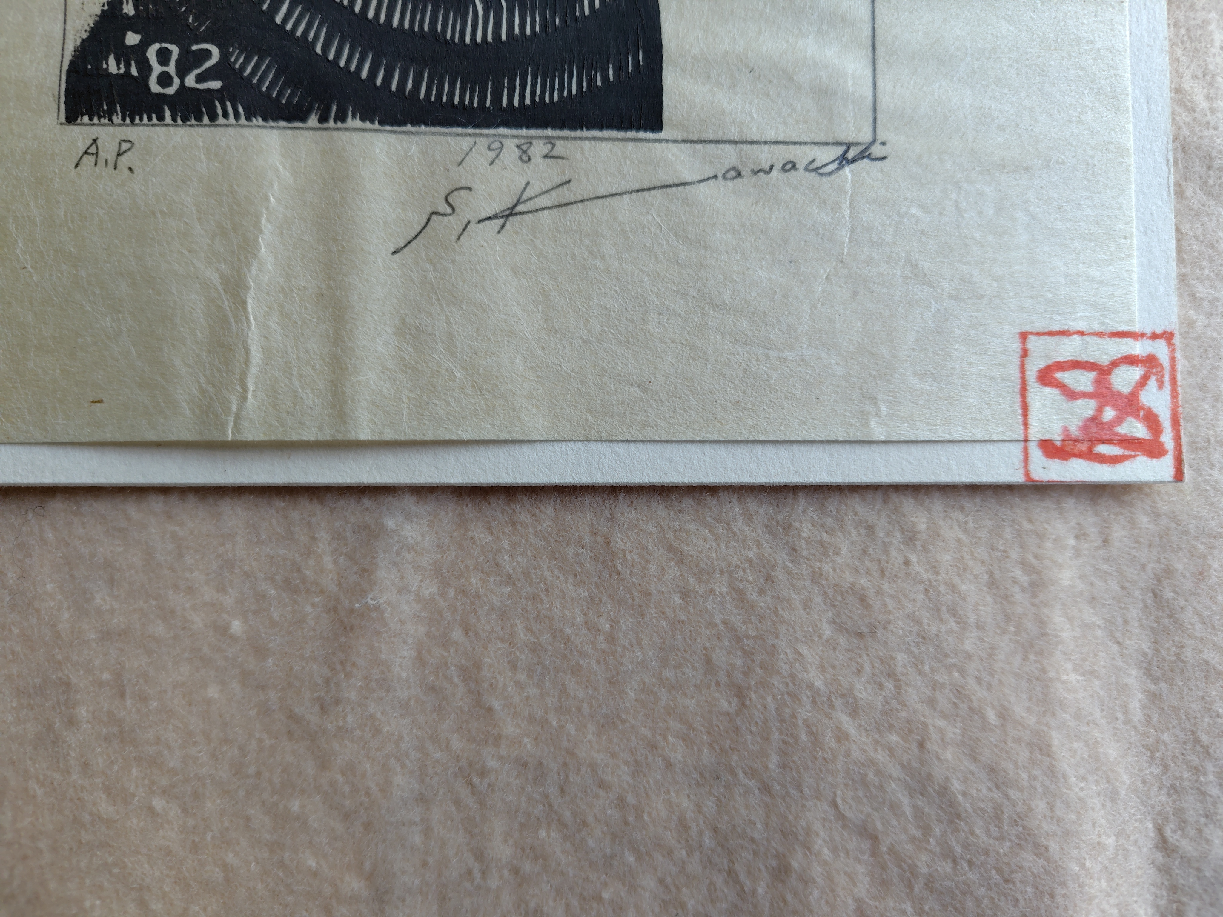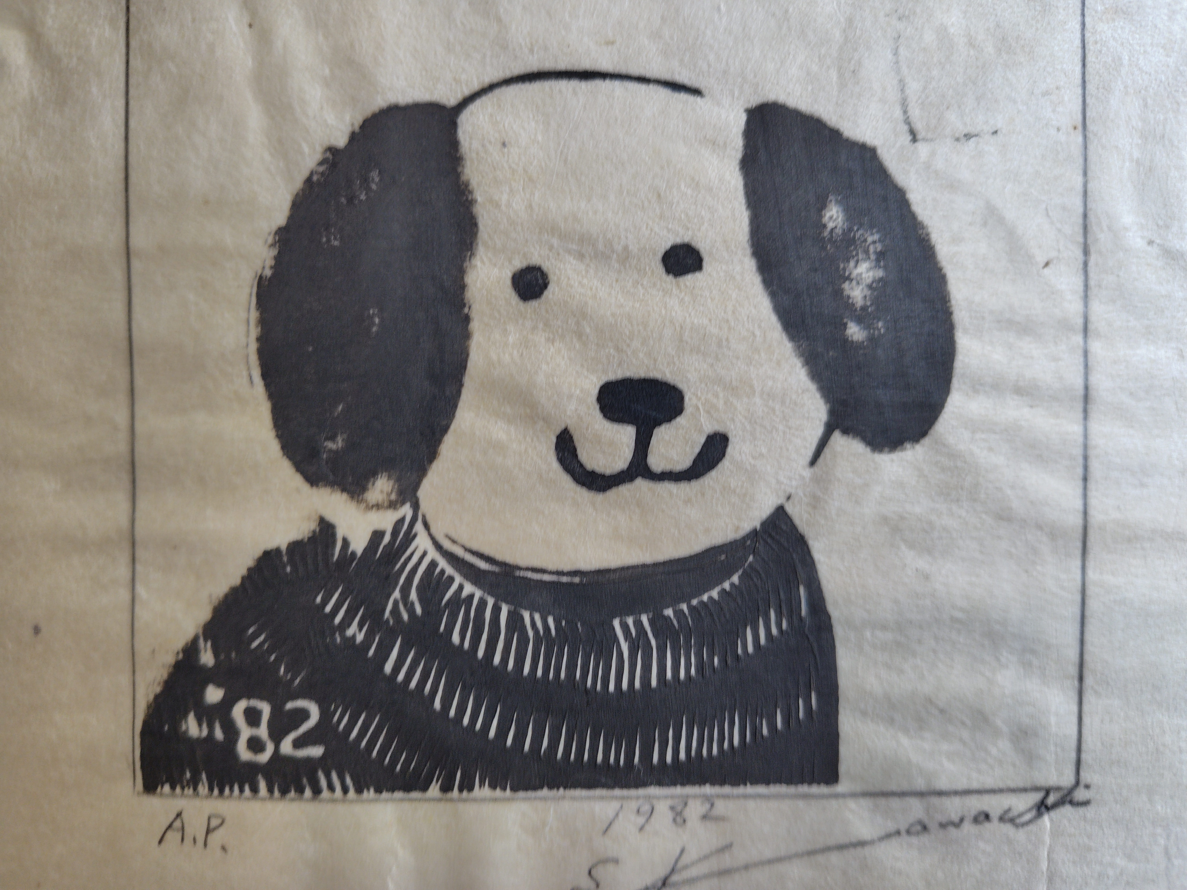 河内成幸(かわち せいこう) 木版画 戌 年賀 1982年 2026.04.14 版画/油絵/浮世絵 河内成幸さんの木版画作品です。1982年の戌年用です。 台紙に貼付されています。大きさは、23x17㎝ エディションナンバーは、AP 状態は、良好です。