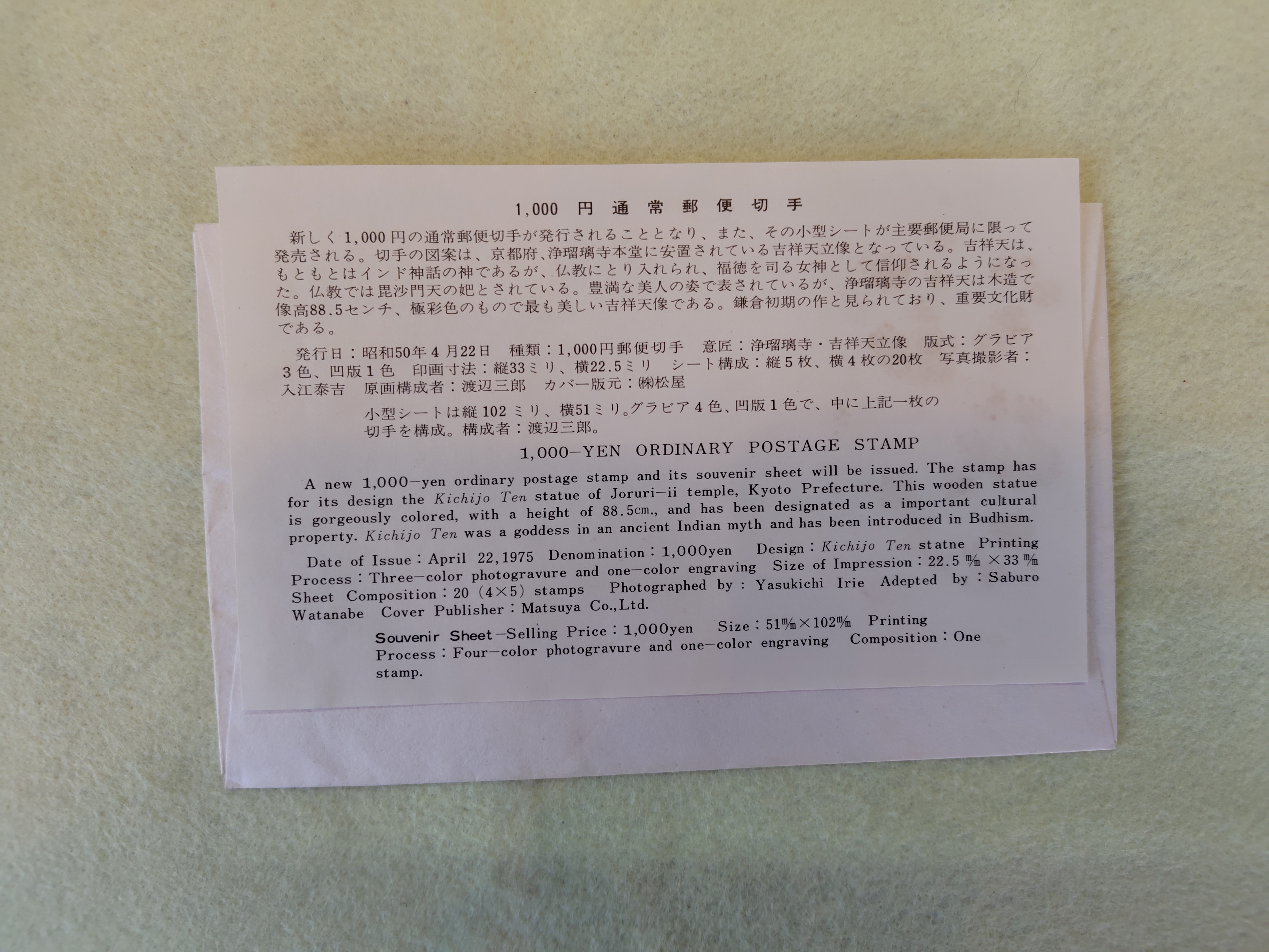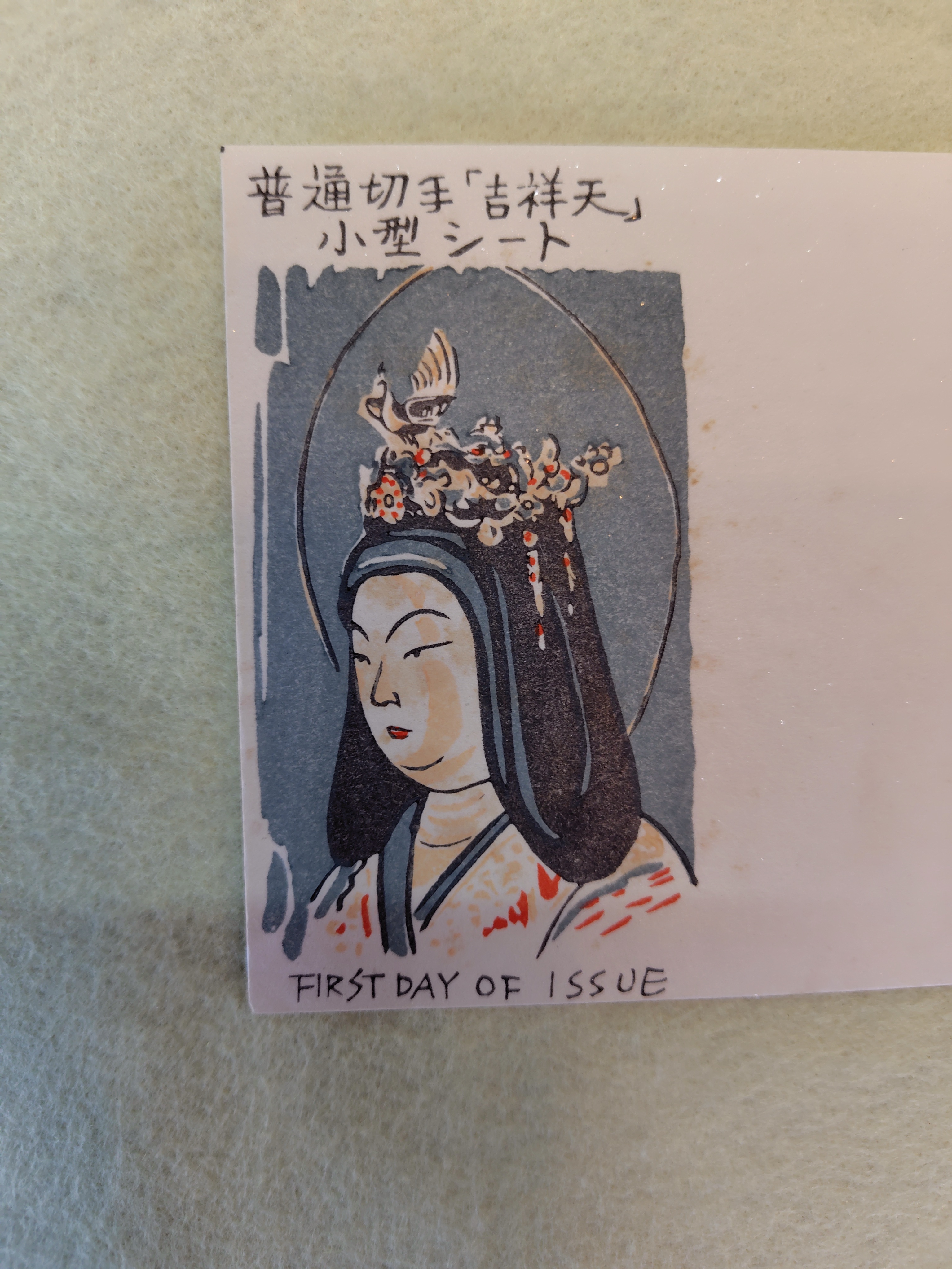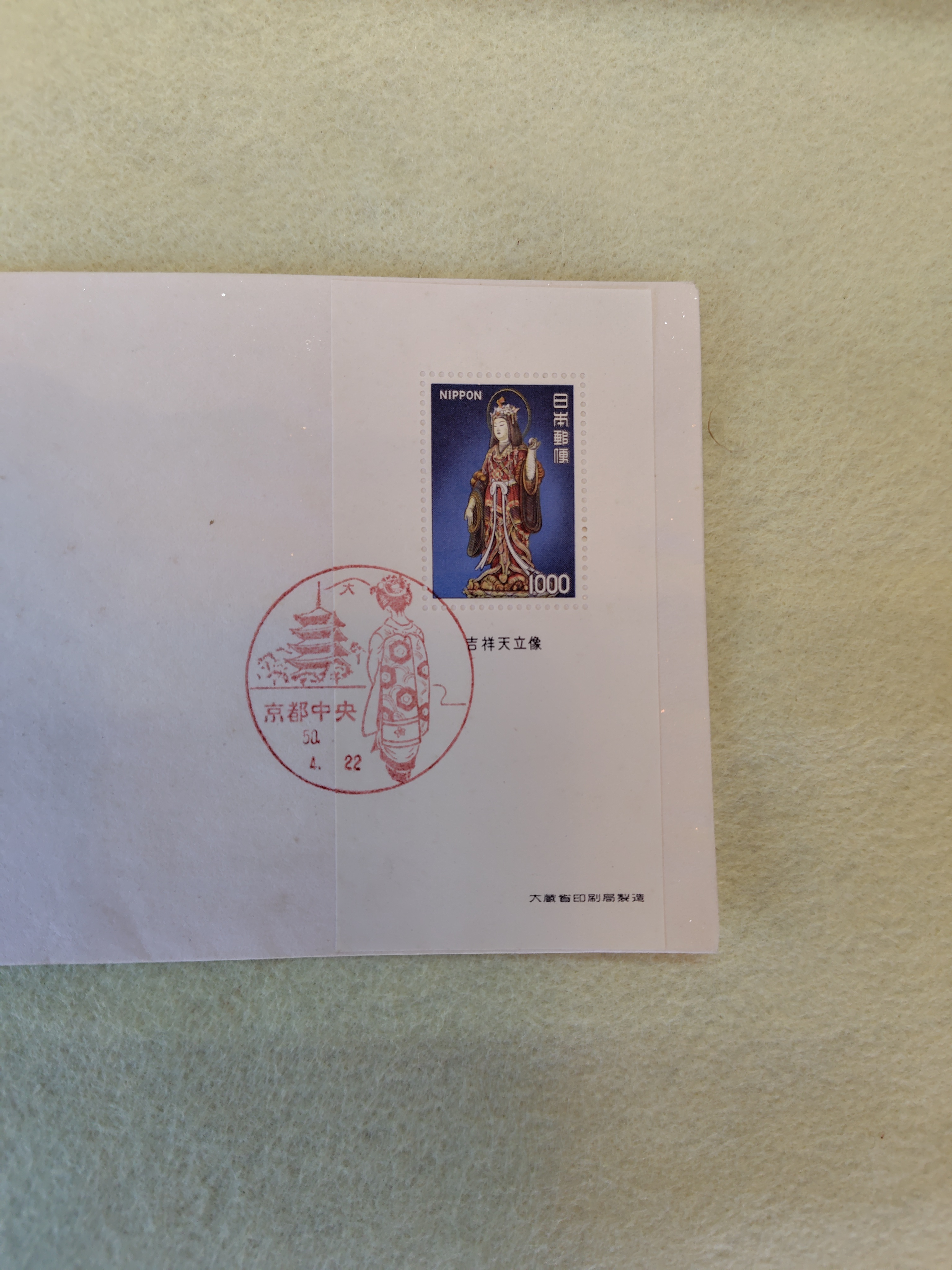 初日カバー 普通切手「吉祥天」小型シート 昭和50年 2026.04.14 家具・雑貨 昭和50年発行の{吉祥天}1000円の小型シートの初日カバーです。 消印は、昭和50年4月22日 京都中央郵便局 状態は、良好です。
