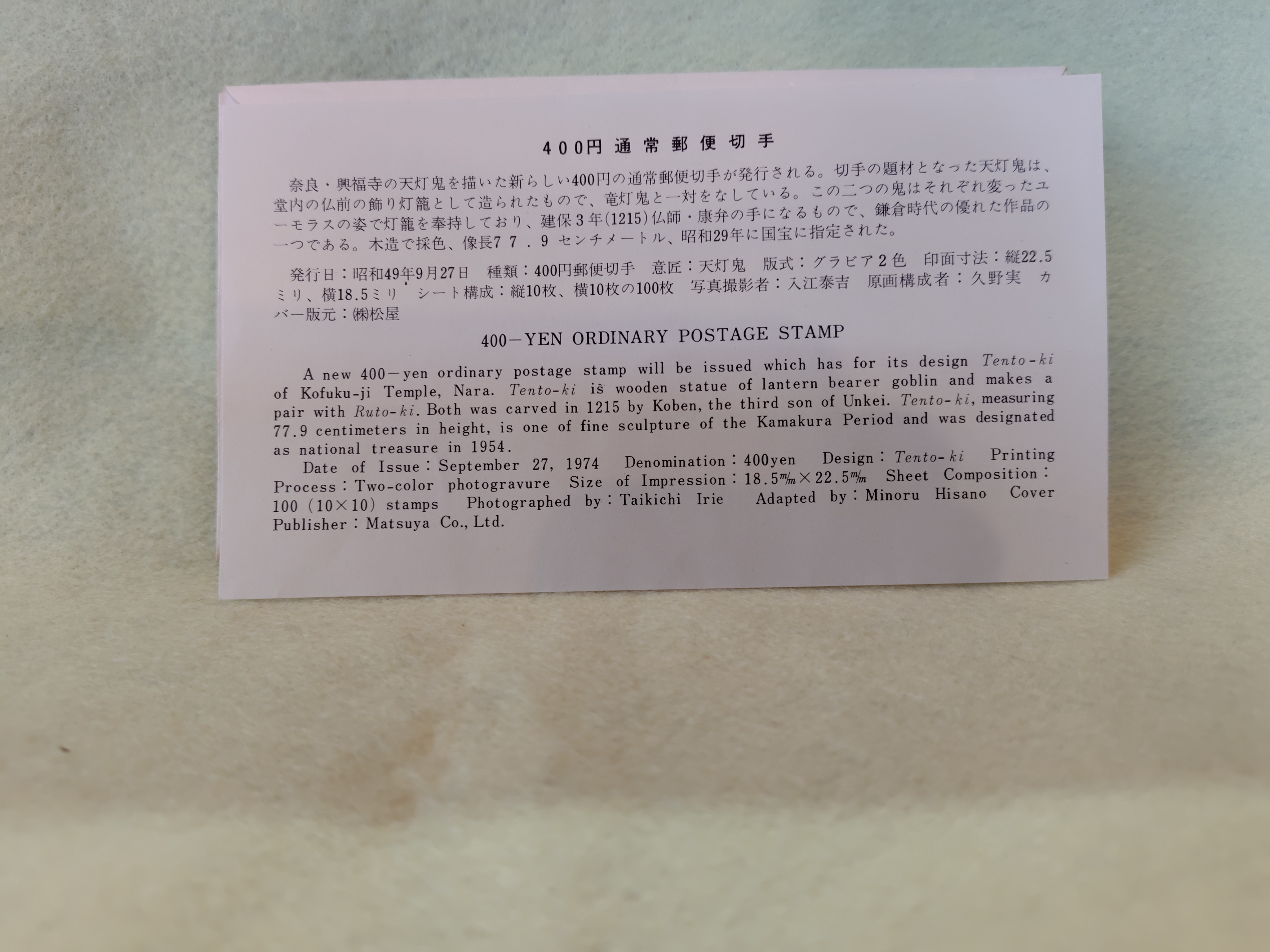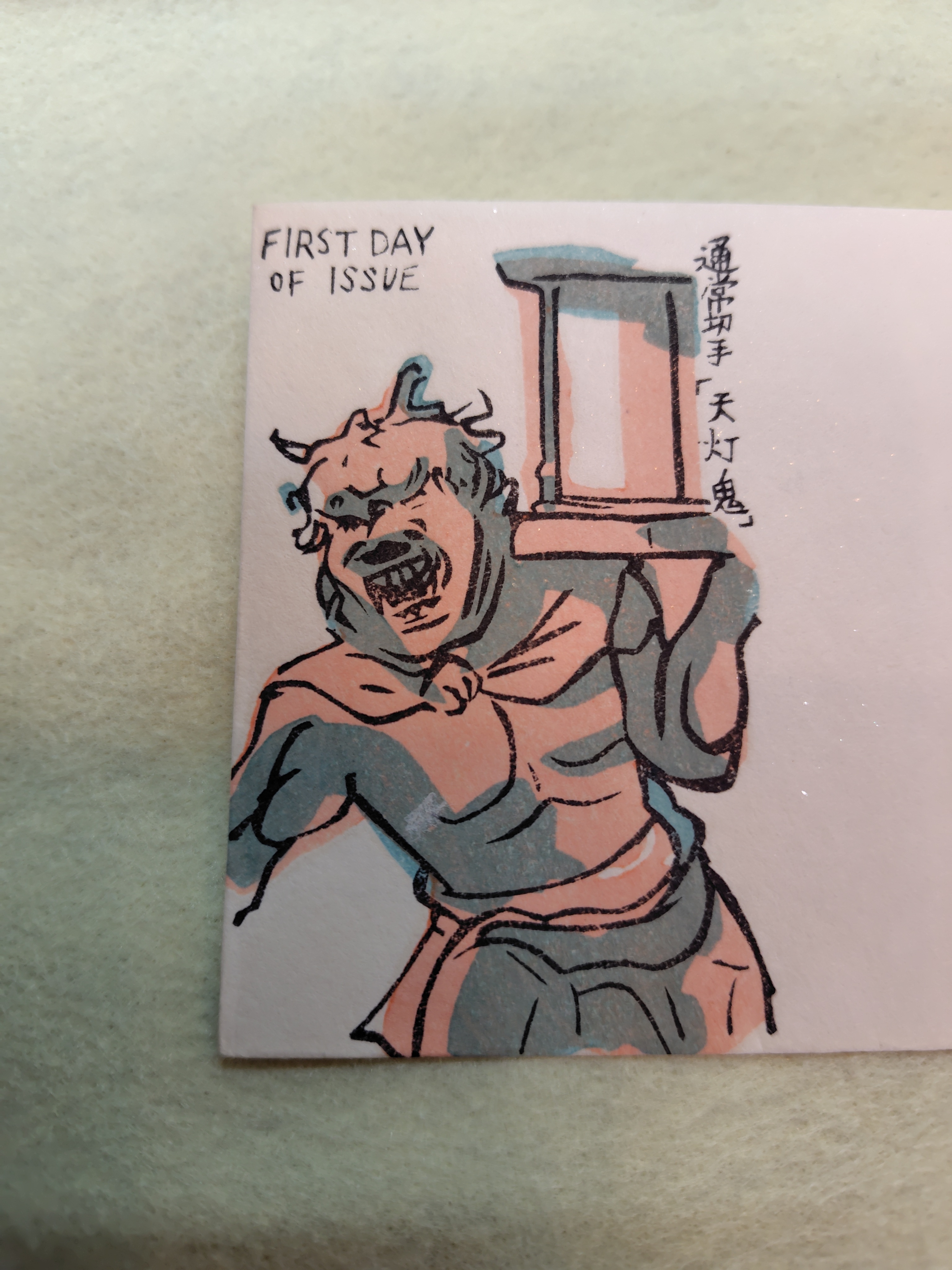 昭和49年に発行された通常切手の「天灯鬼」の初日カバーです。