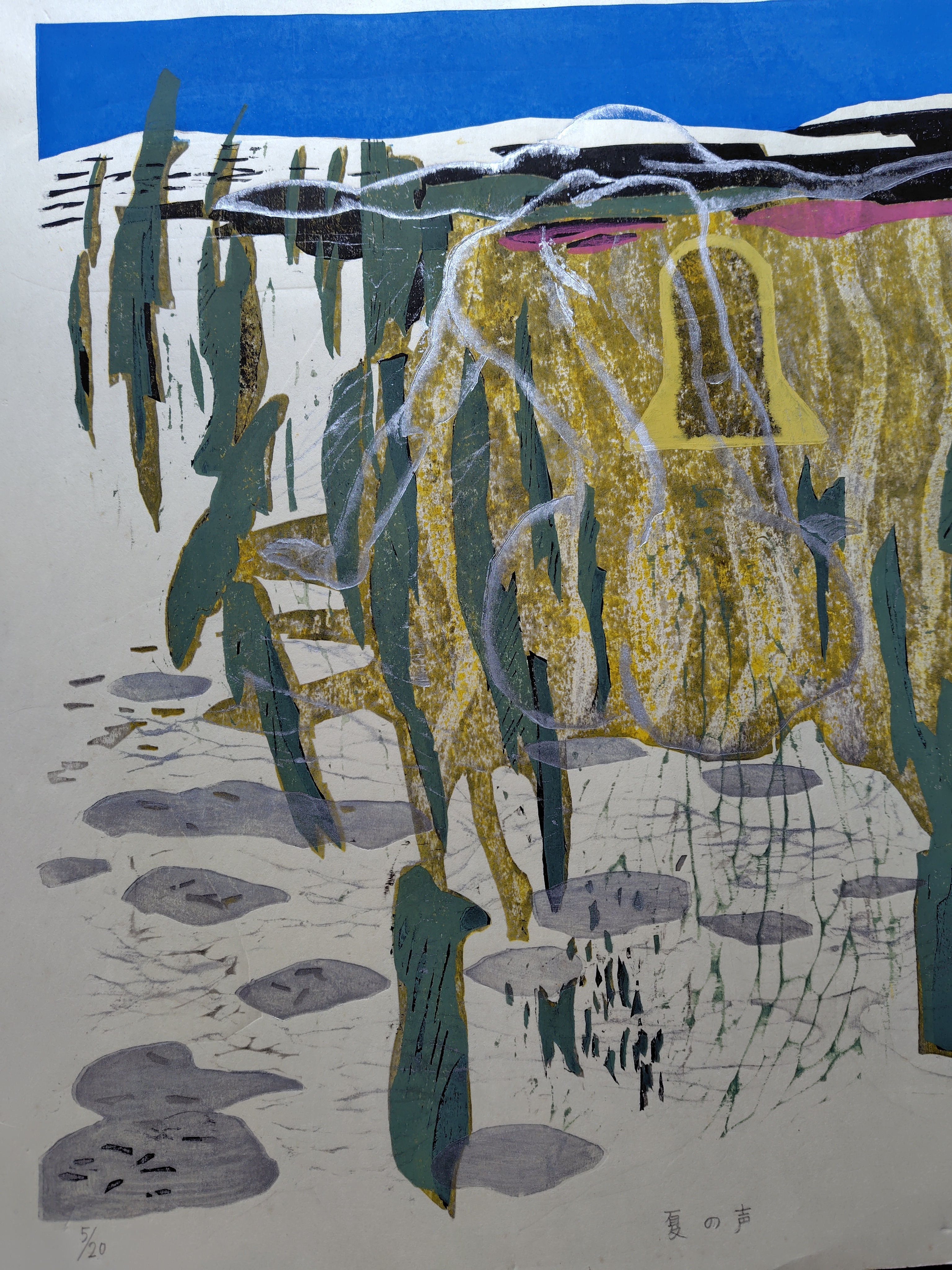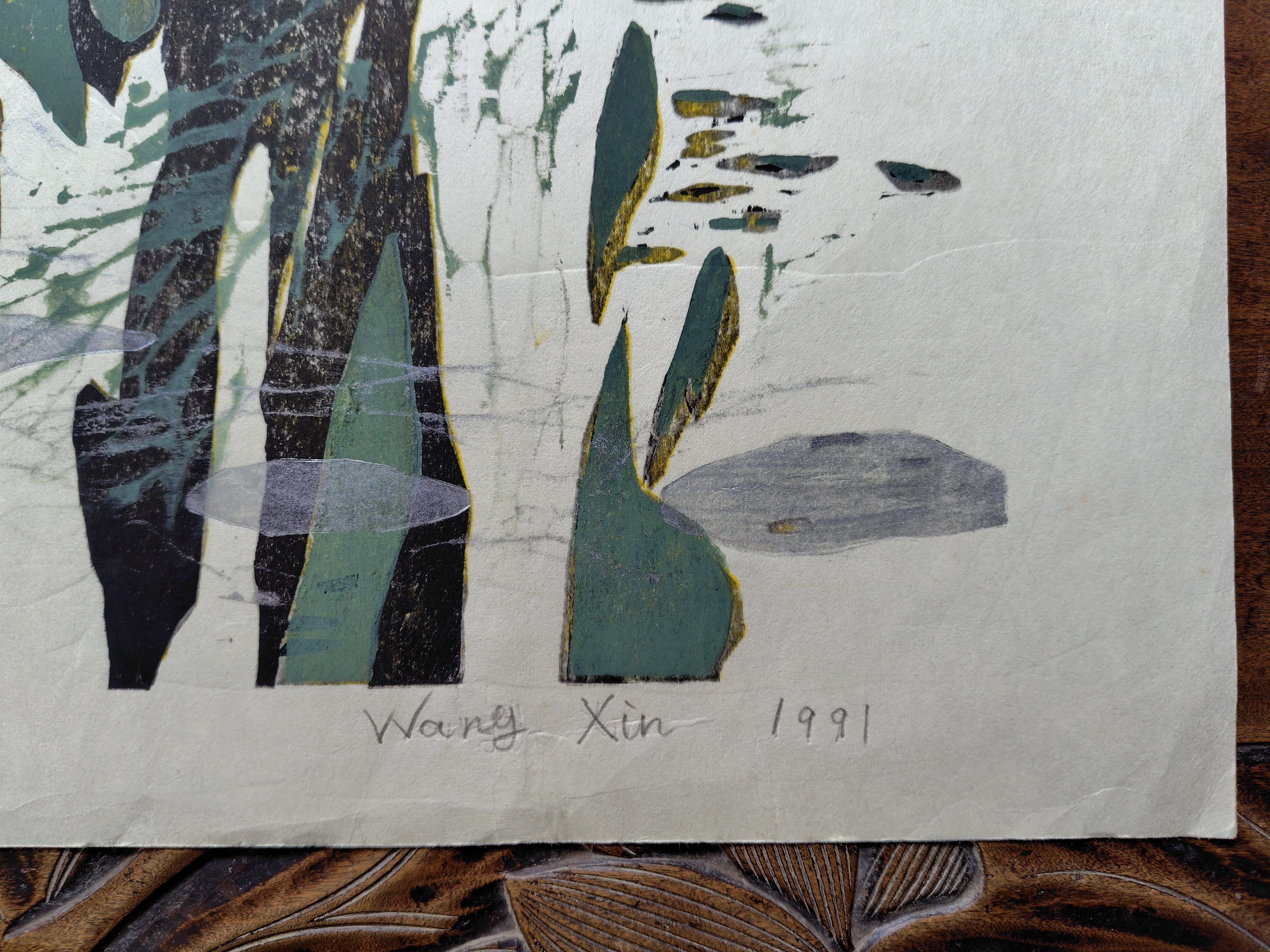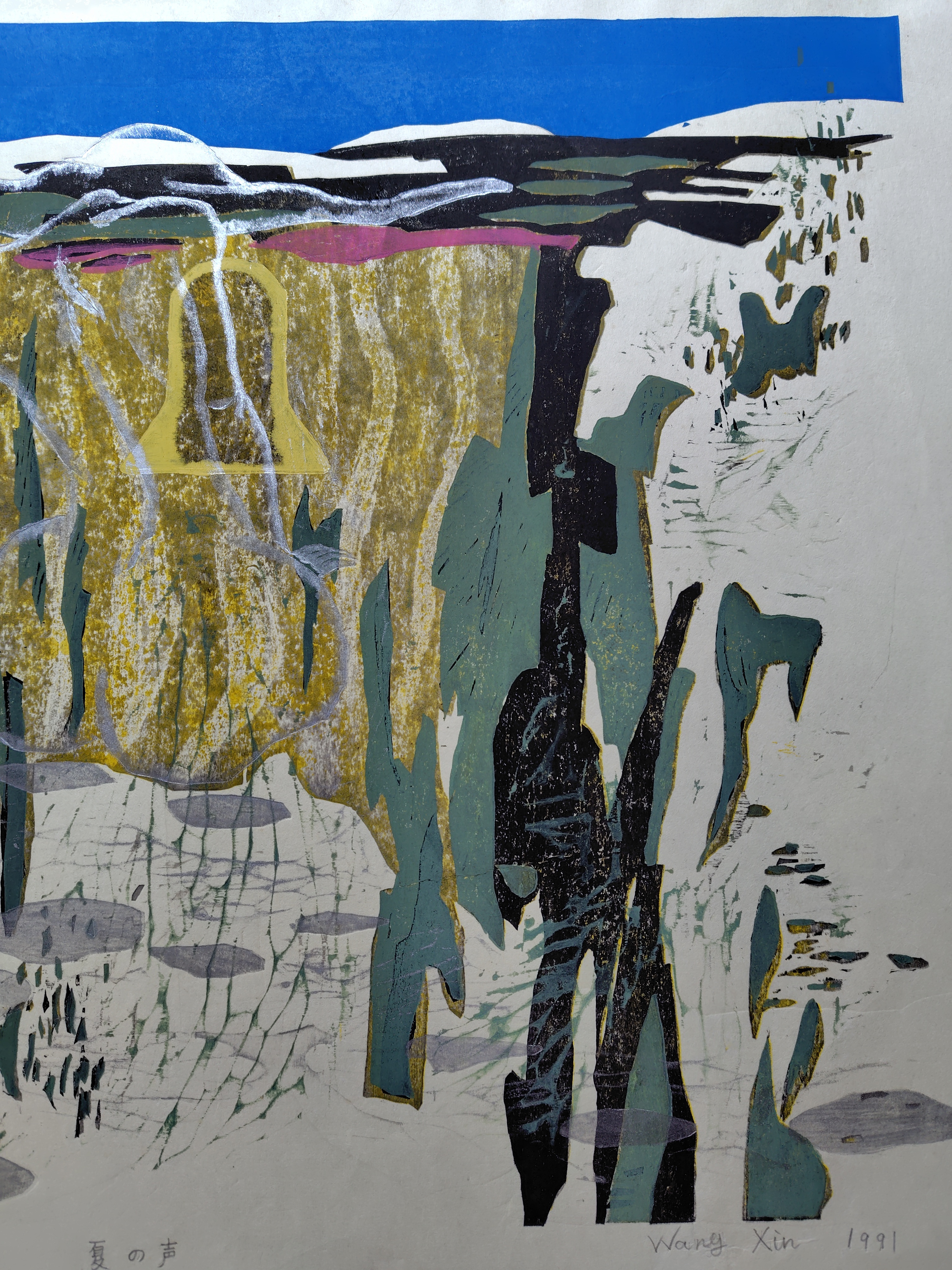 王欣 木版画 夏の声 2025.10.28 版画/油絵/浮世絵 中国の王欣さんの木版画です。タイトルは夏の声 1991年の制作 シートの大きさは、59x68㎝ エディションナンバーは、5/20 状態は、良好です。