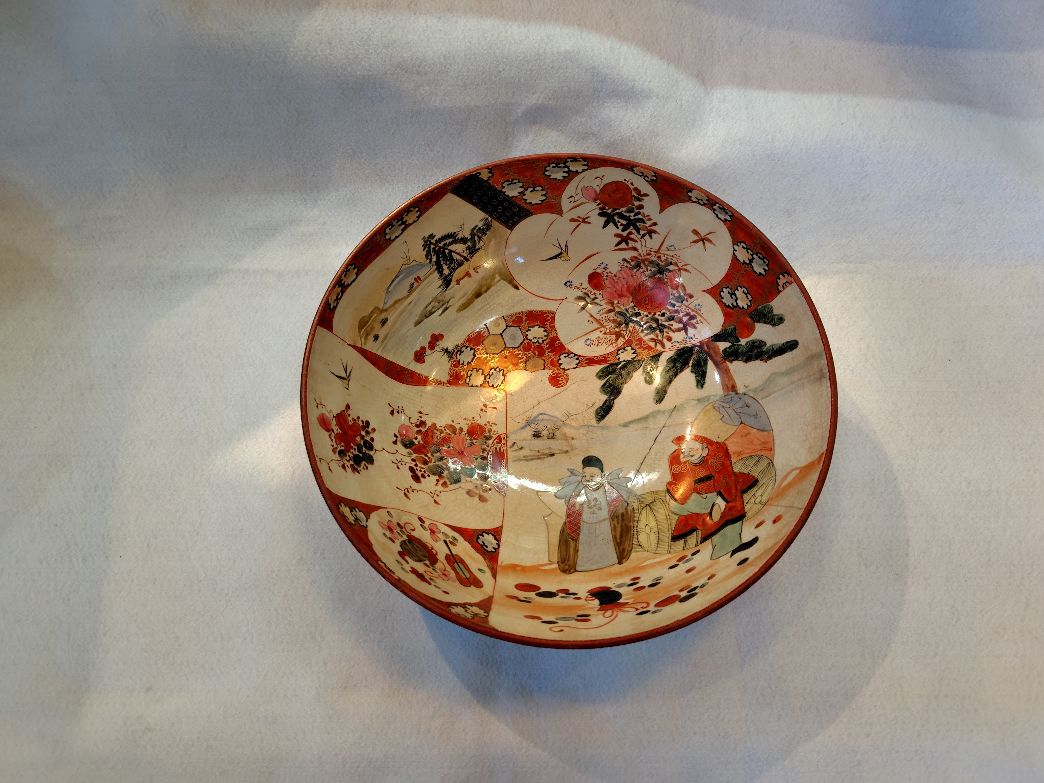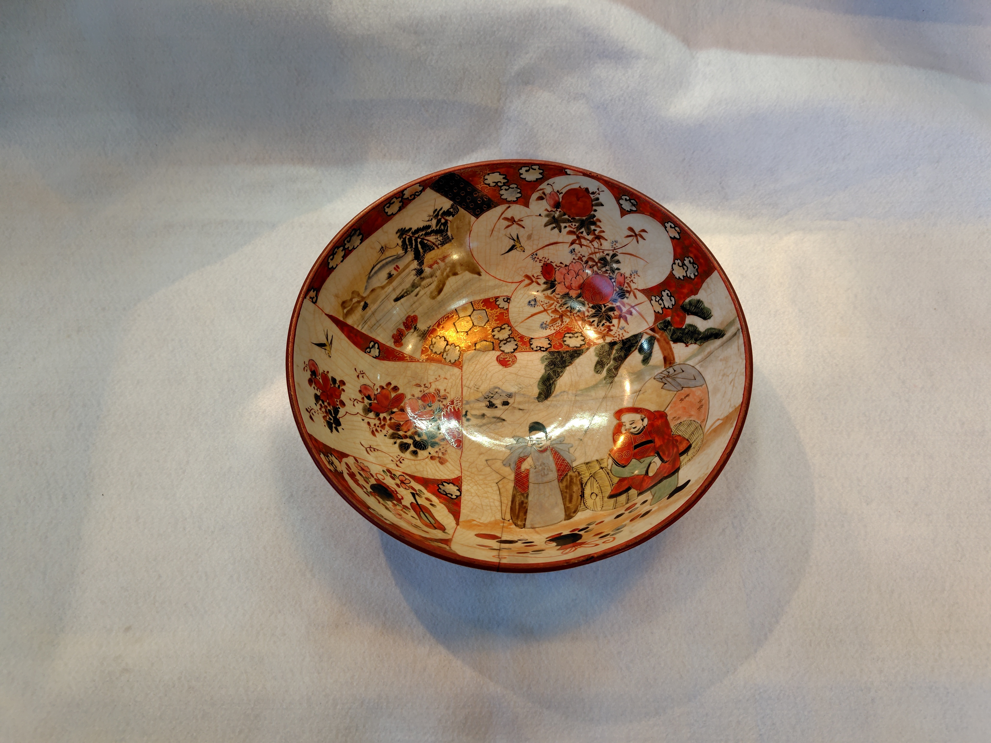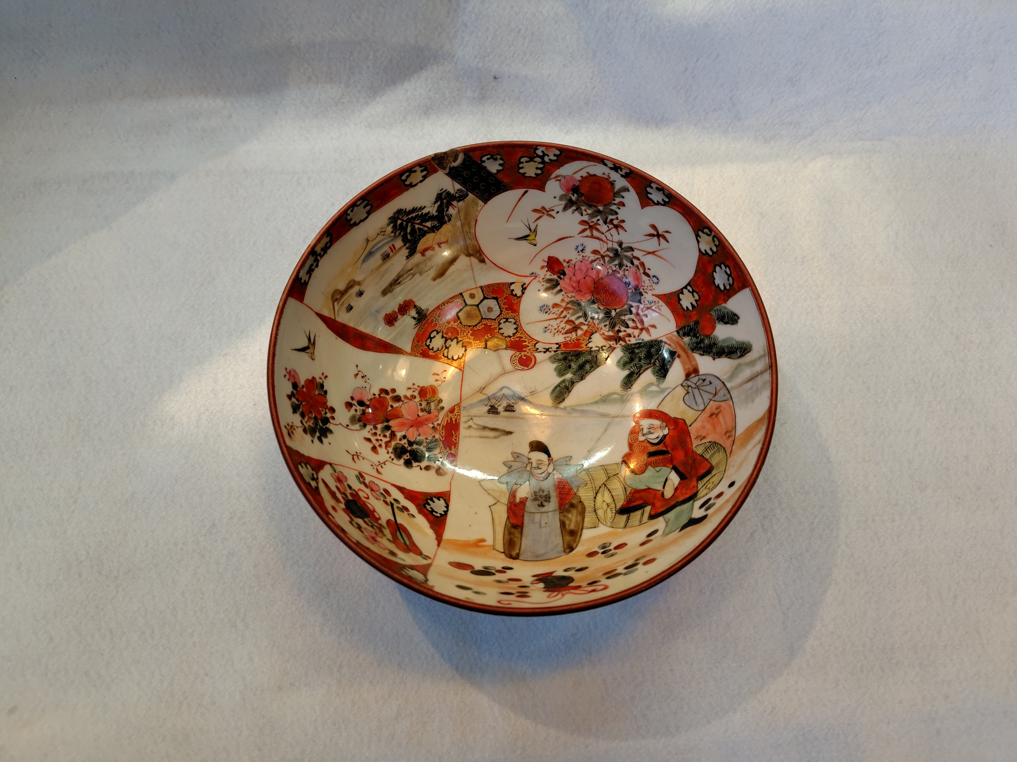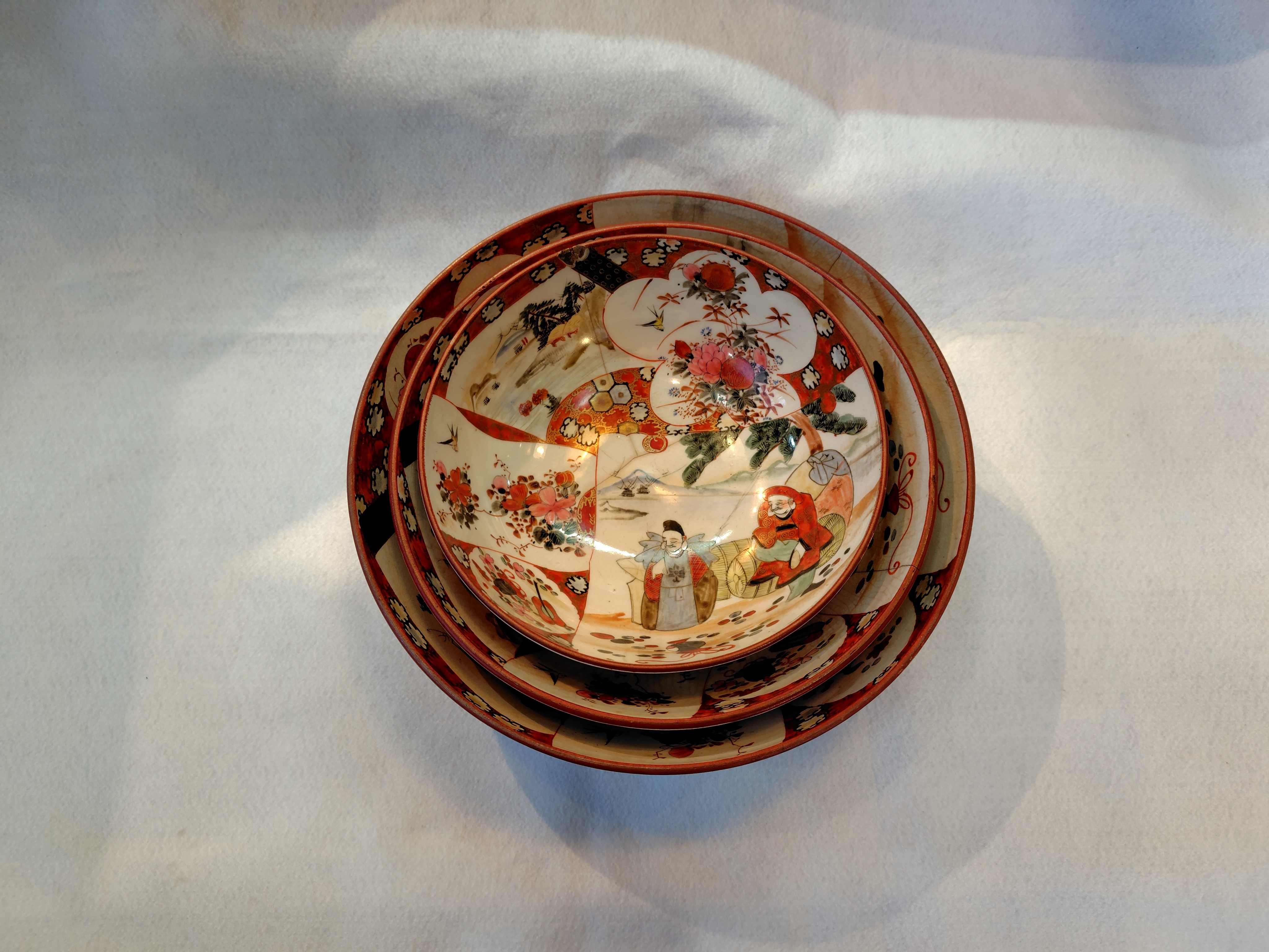九谷 赤絵 三つ組鉢 明治 2025.11.17 食器 明治時代の九谷の赤絵の三つ組鉢です。 大きさは、口径18㎝ 高さ6cm 口径21㎝ 高さ7㎝ 口径24㎝ 高さ8㎝ 状態は、3点ともひび 貫入など有り よくありません。