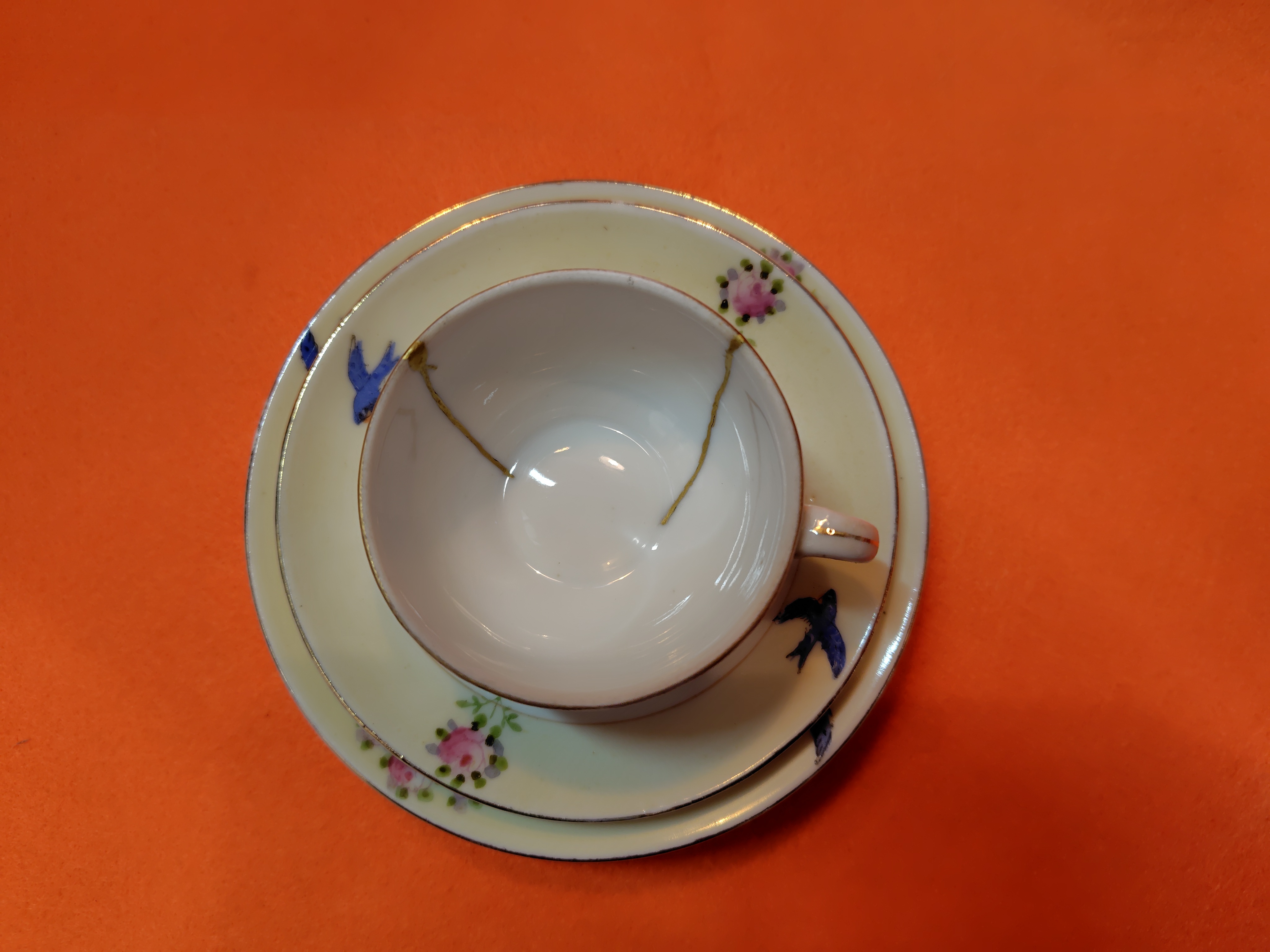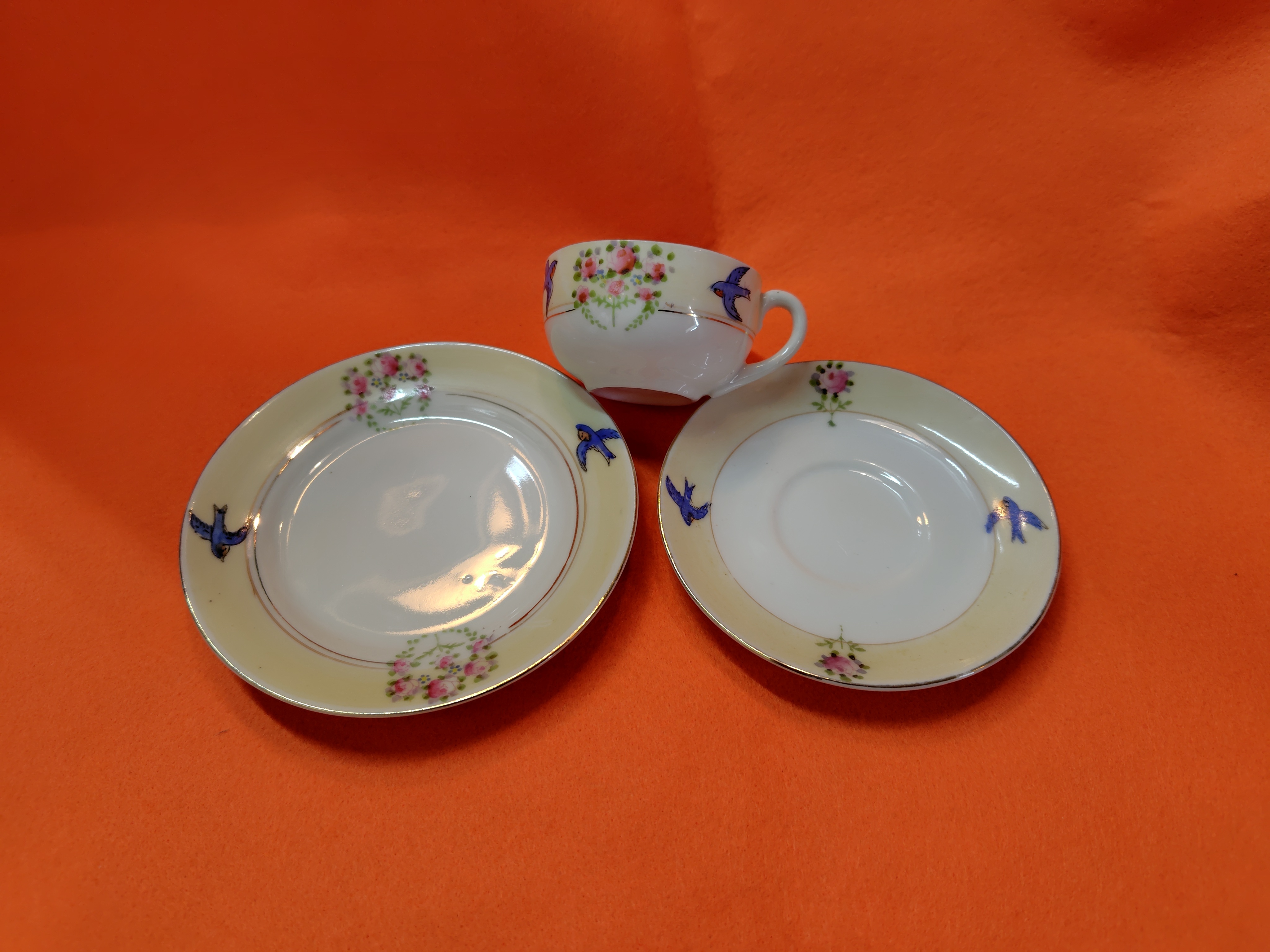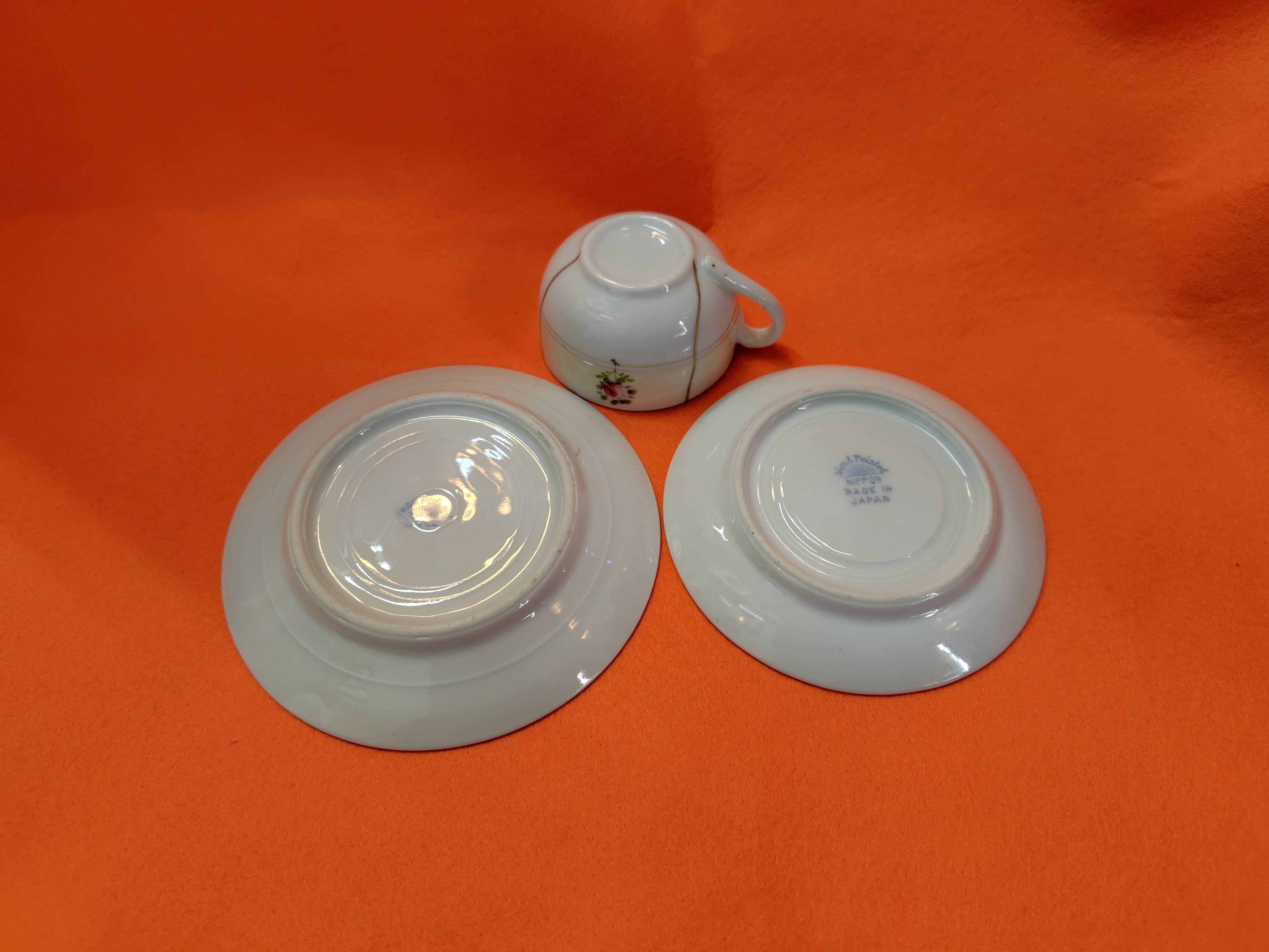 ノリタケ ミニチュアカップ トリオ 2025.12.21 食器 ノリタケのミニチュアカップ トリオです。1920年ころの製品です。 ケーキ皿 11㎝ ソーサー9・5㎝ カップ口径5・5㎝ 高さ3センチ 状態は、カップは金継ぎされています。