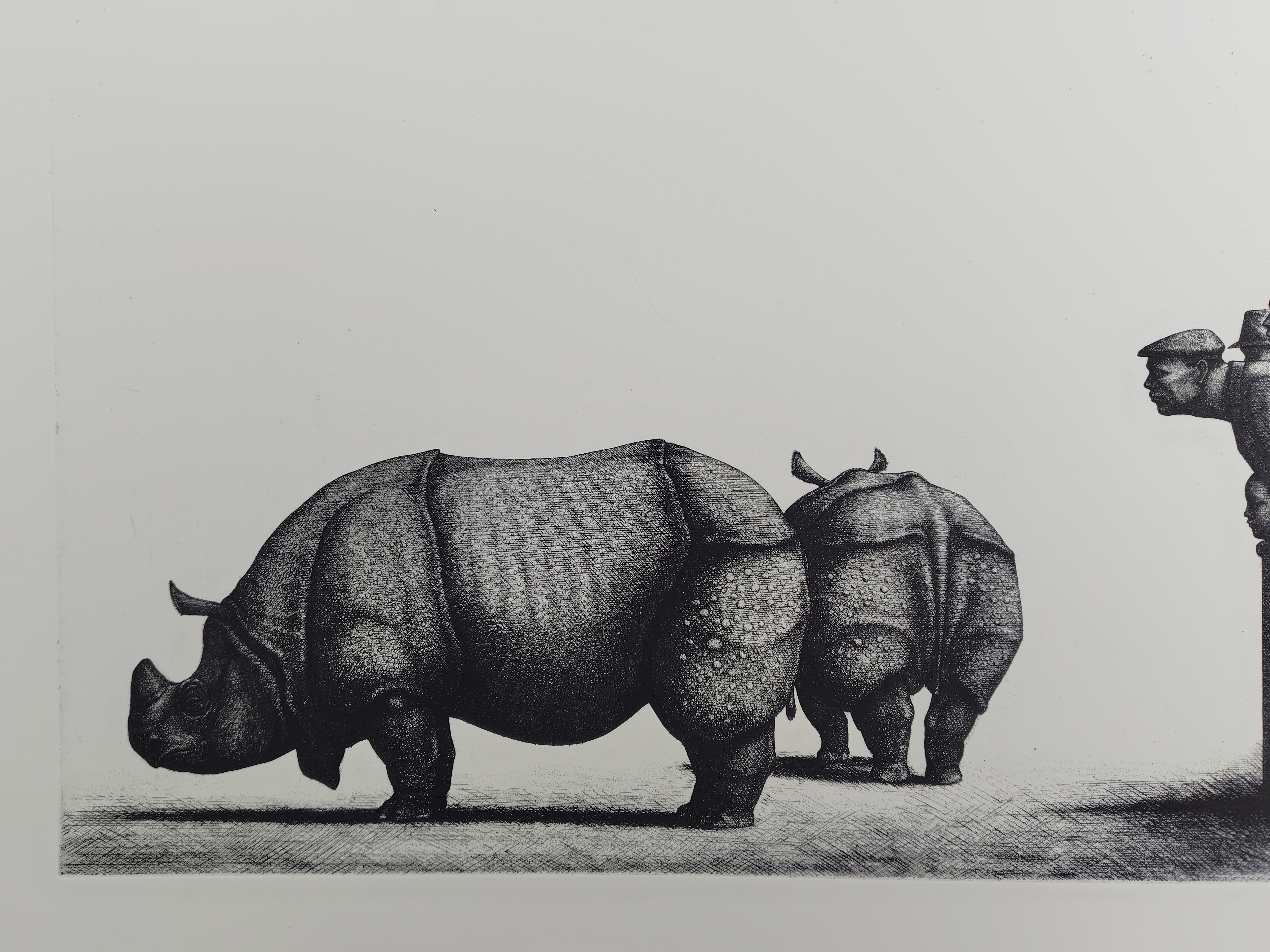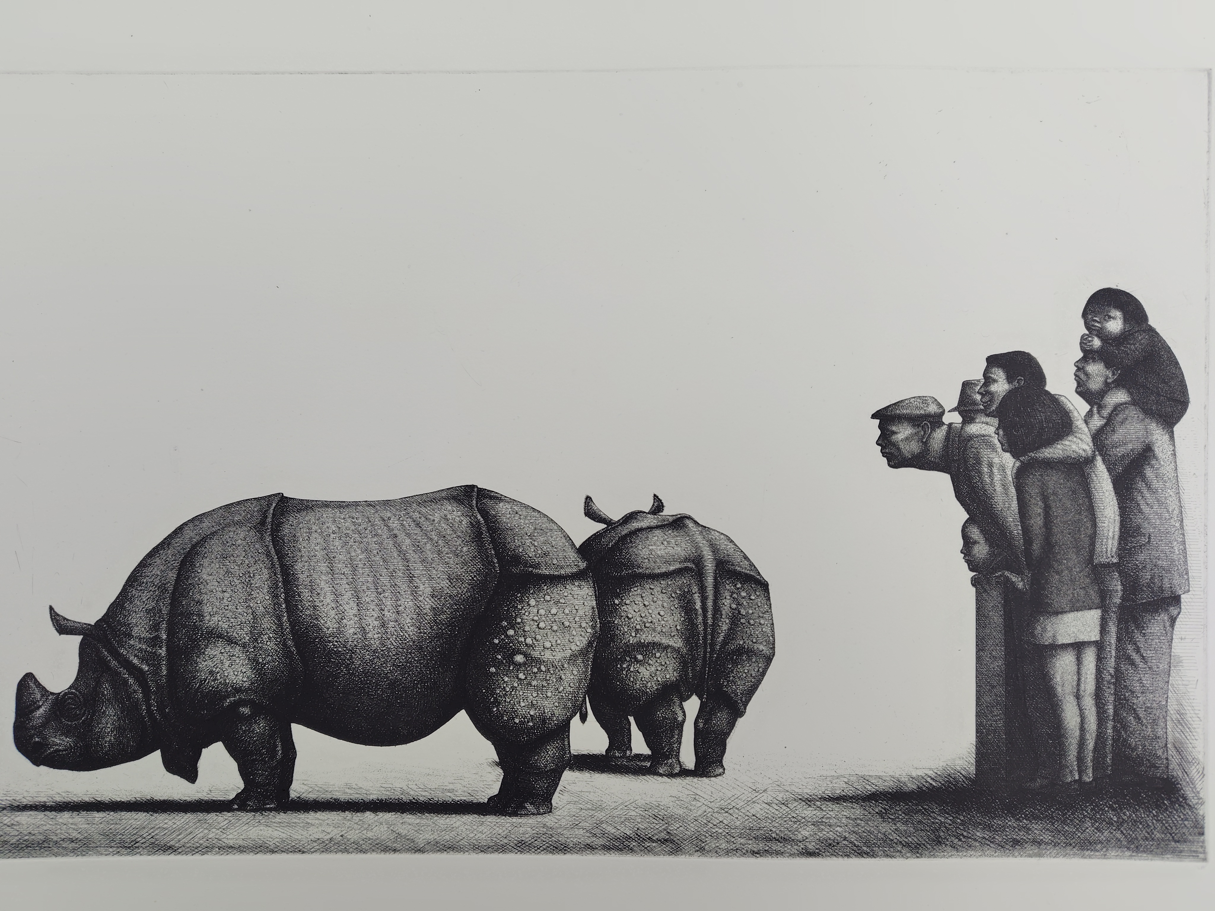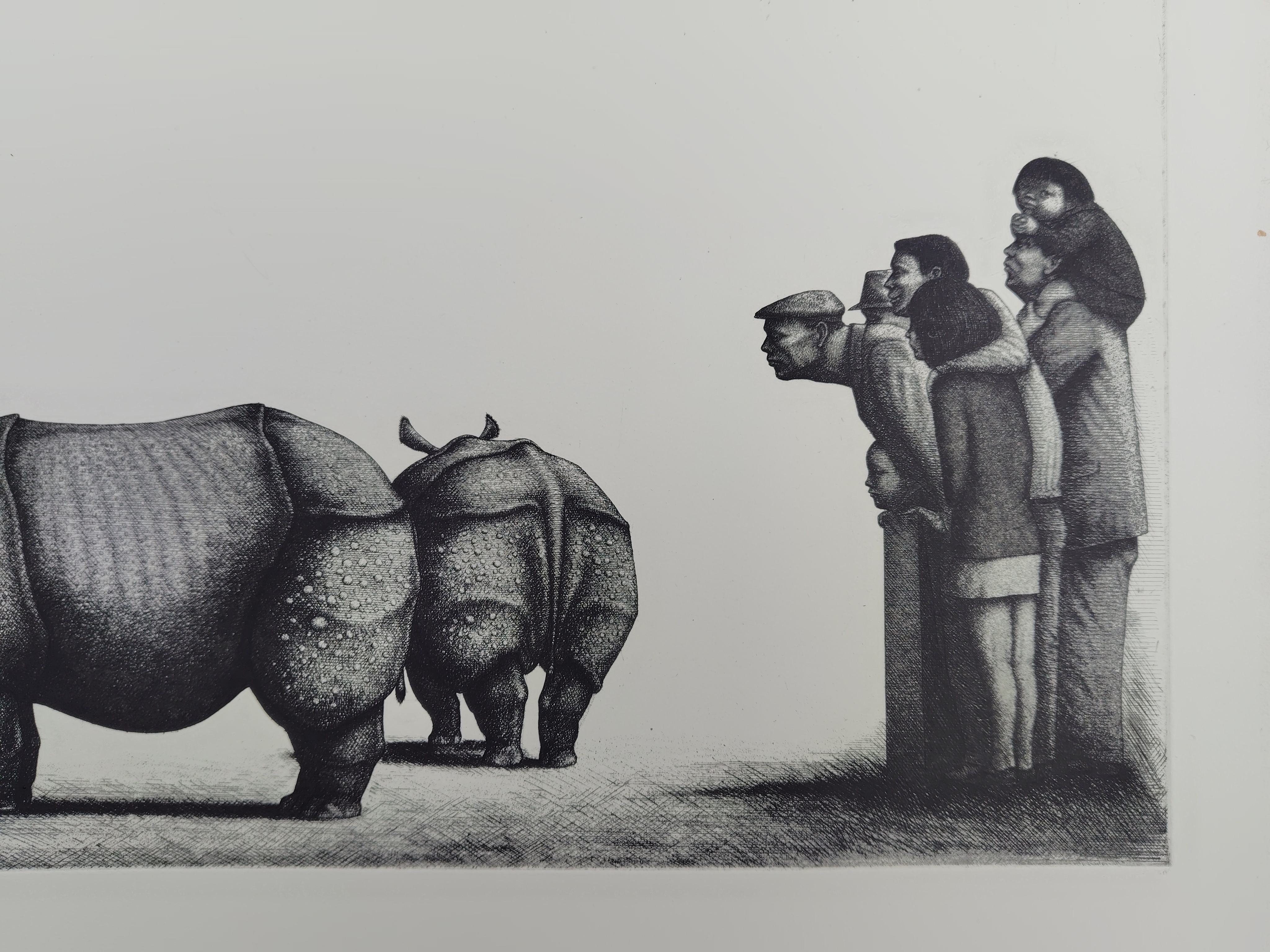 相笠昌義(あいがさ まさよし) 銅版画 2025.12.21 版画/油絵/浮世絵 相笠昌義さんの銅版画作品です。タイトルは、『動物園 サイを見る人』 シートの大きさは、40x55㎝ エディションナンバーは、有りません。 作者のサインも有りません。 状態は、良好です。