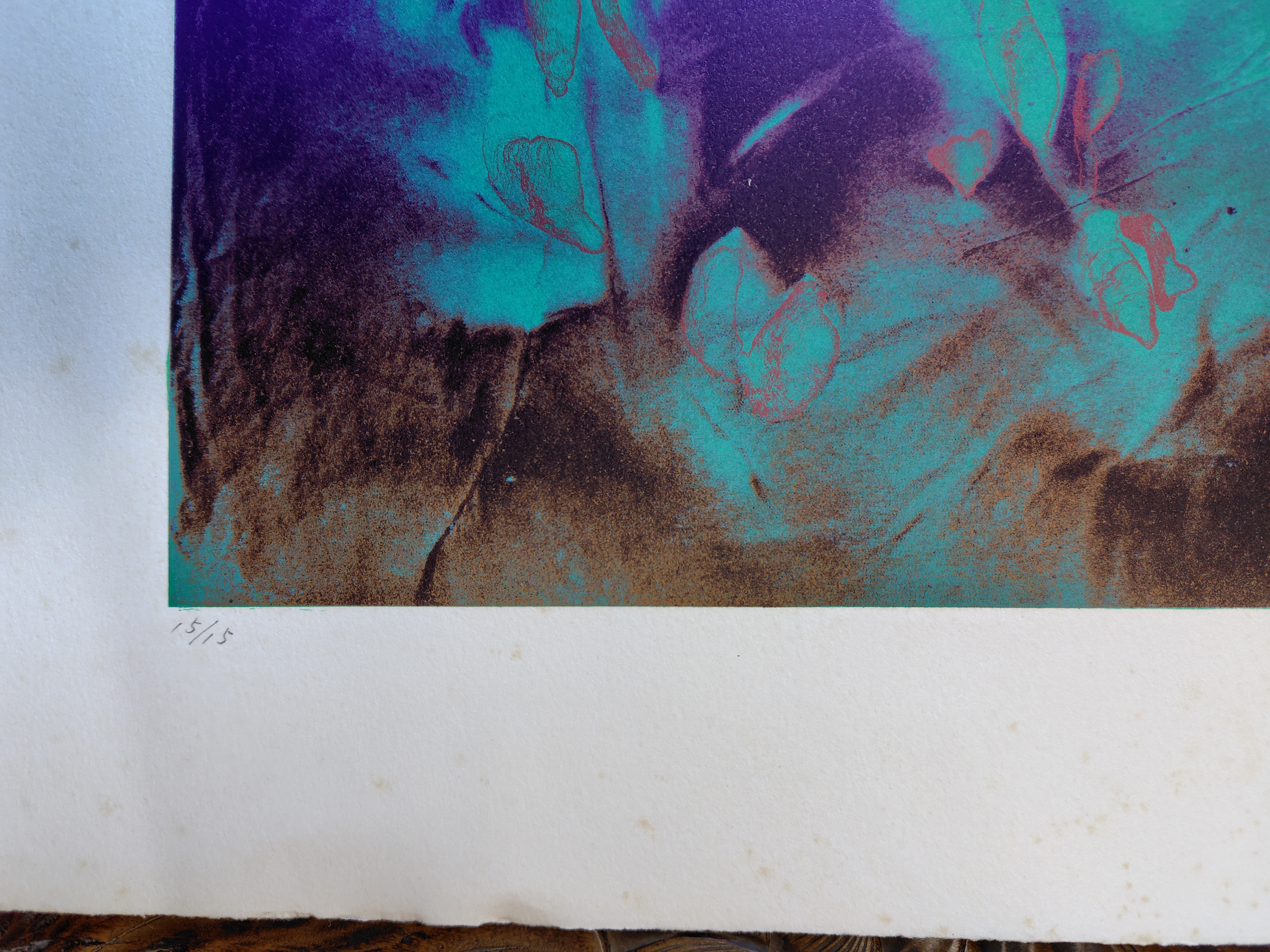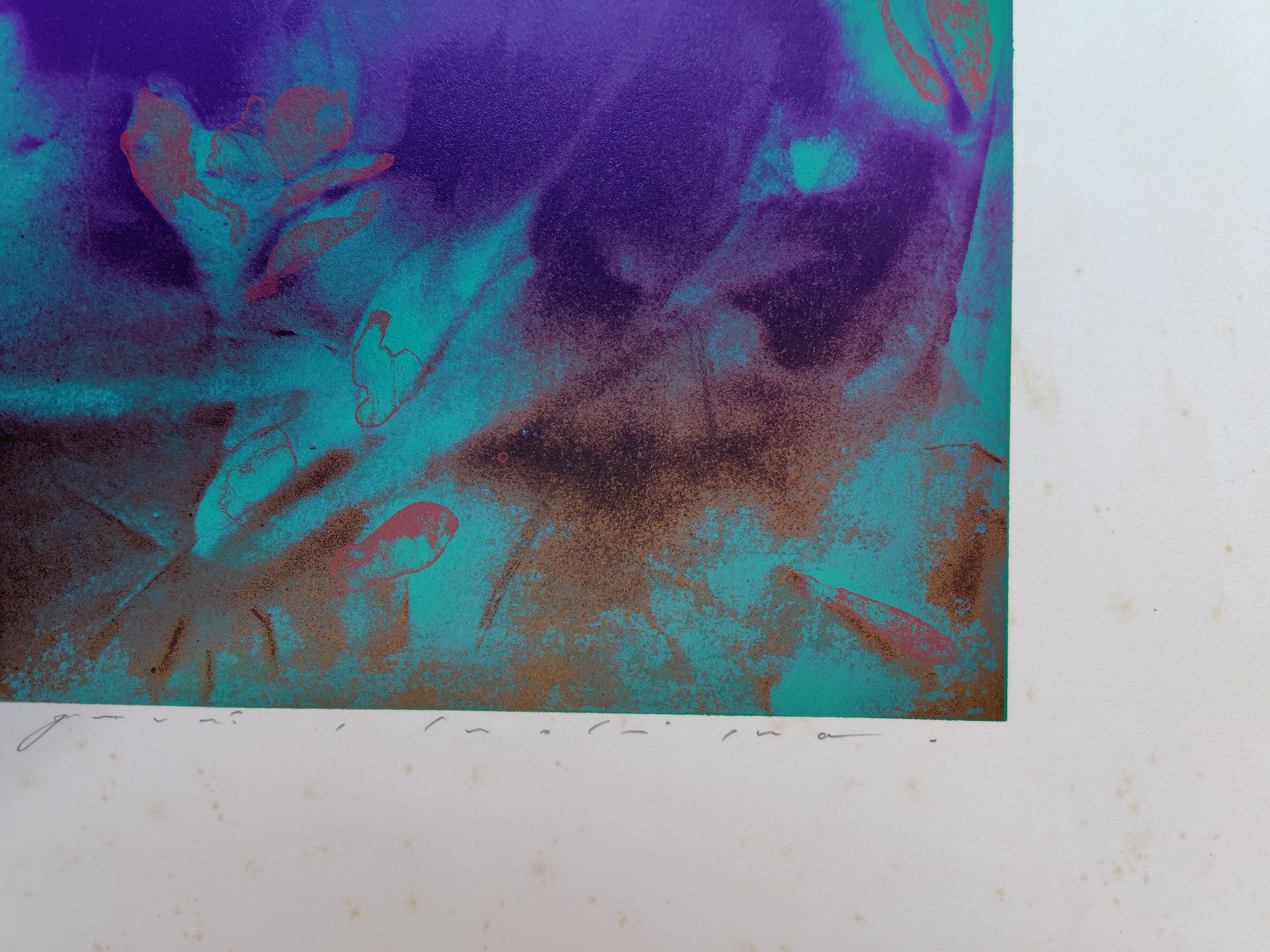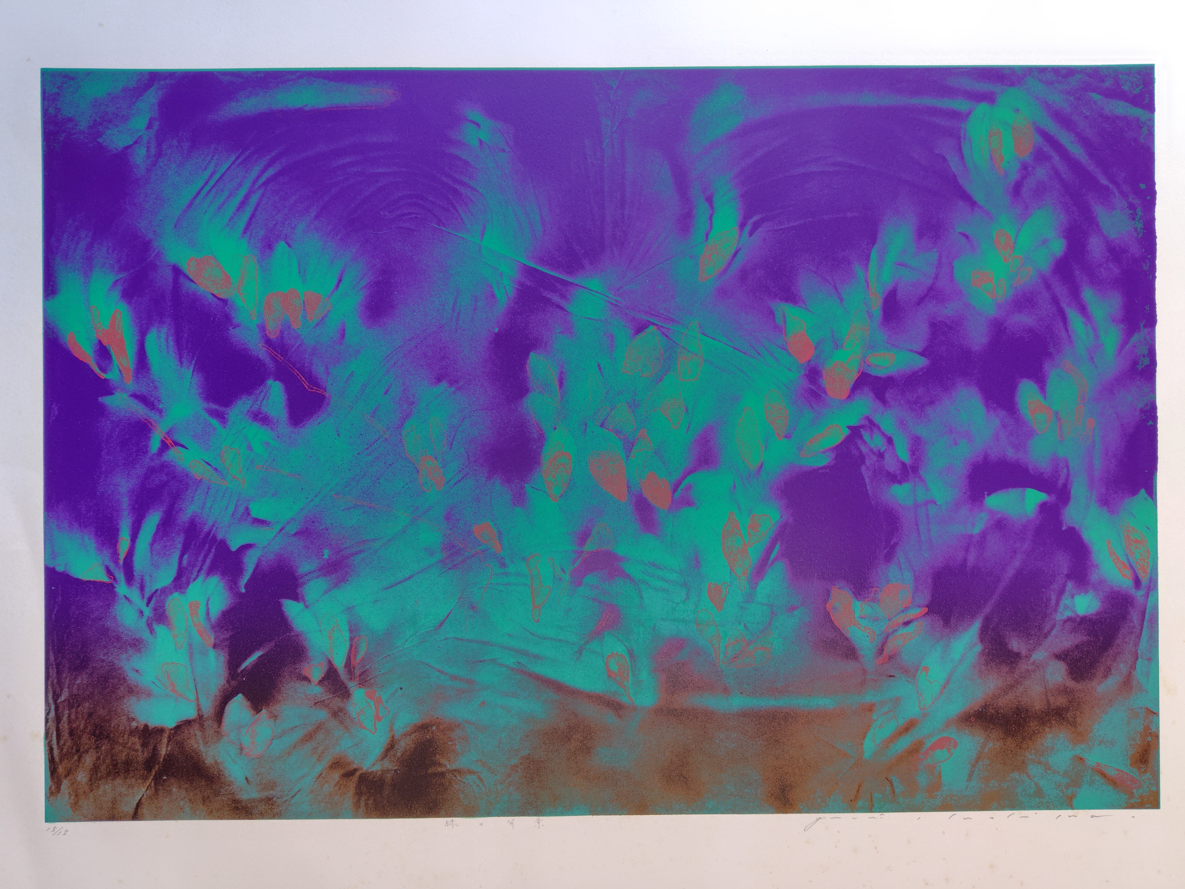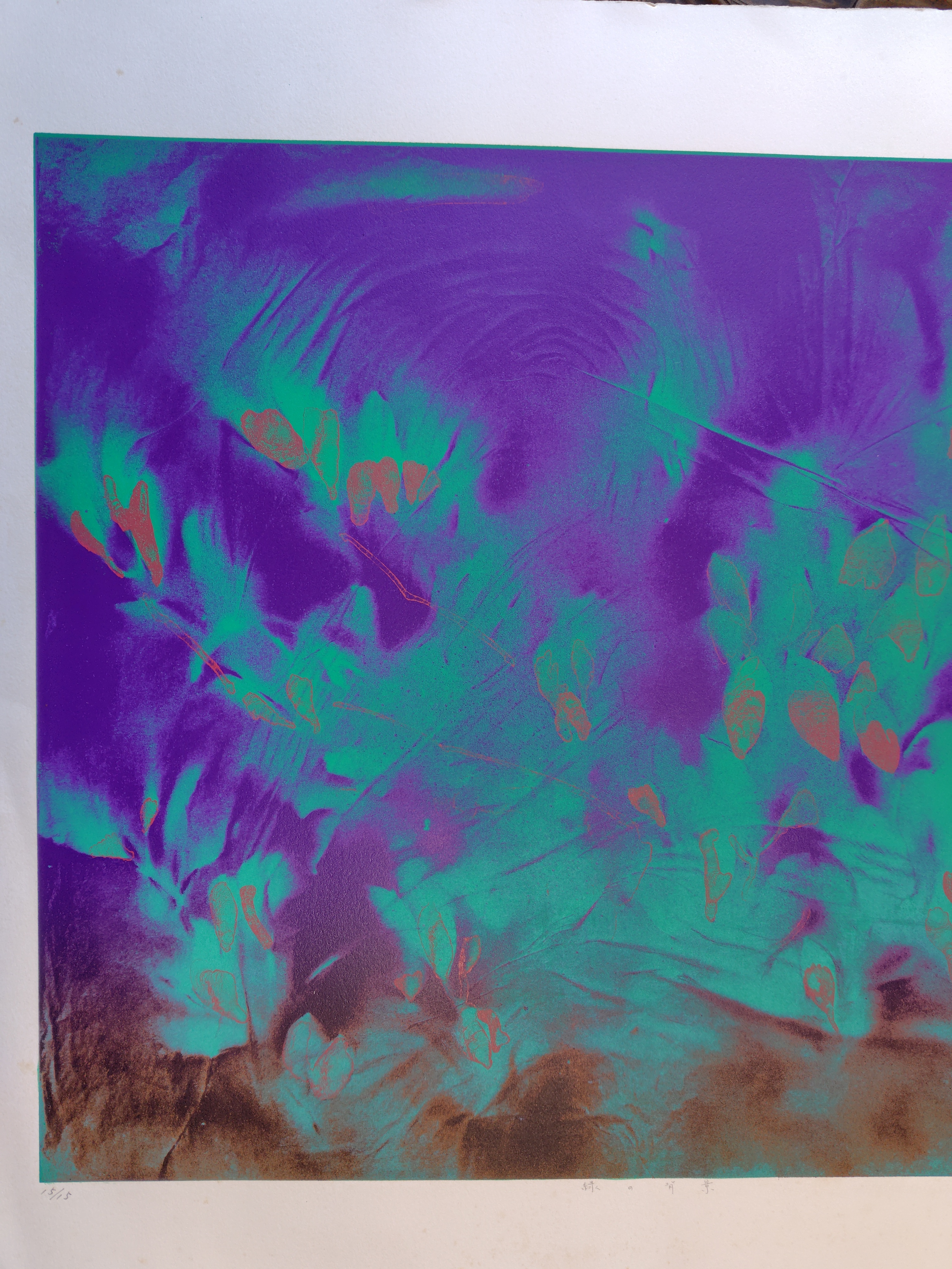作者不詳 シルクスクリーン 2025.12.27 版画/油絵/浮世絵 作者不詳のシルクスクリーンです。タイトルは、『緑の背景』 作者のサインは有りますが、読めません。 シートの大きさは、64x92㎝ エディションナンバーは、15/15 状態は、良好です。
