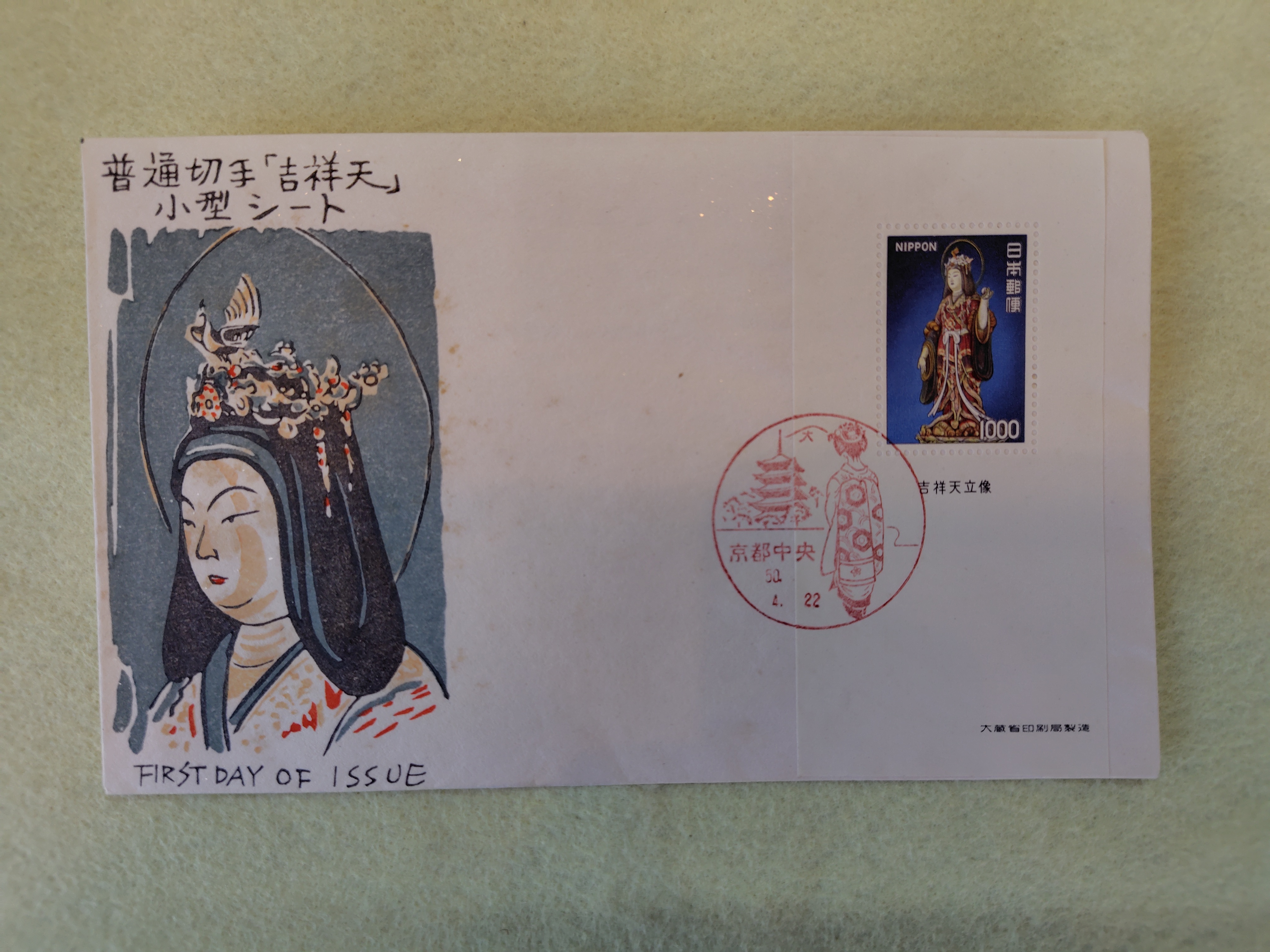 昭和50年発行の{吉祥天}1000円の小型シートの初日カバーです。