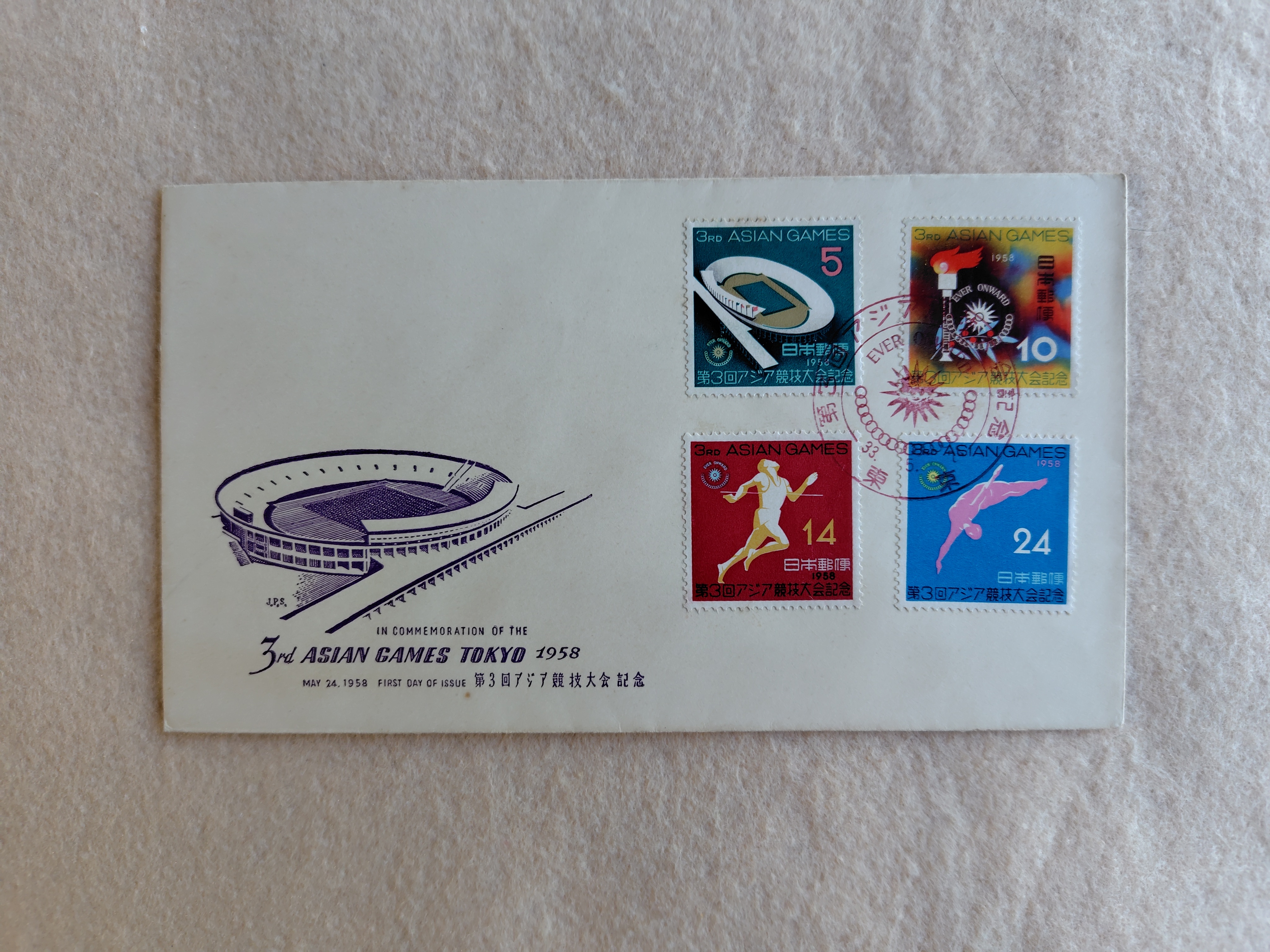 1958年に開催された第3回アジア競技大会の開催を記念して発行された切手の初日カバ-です。